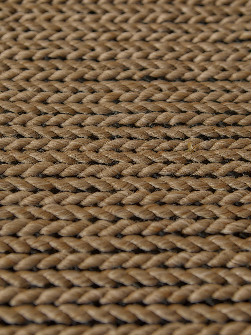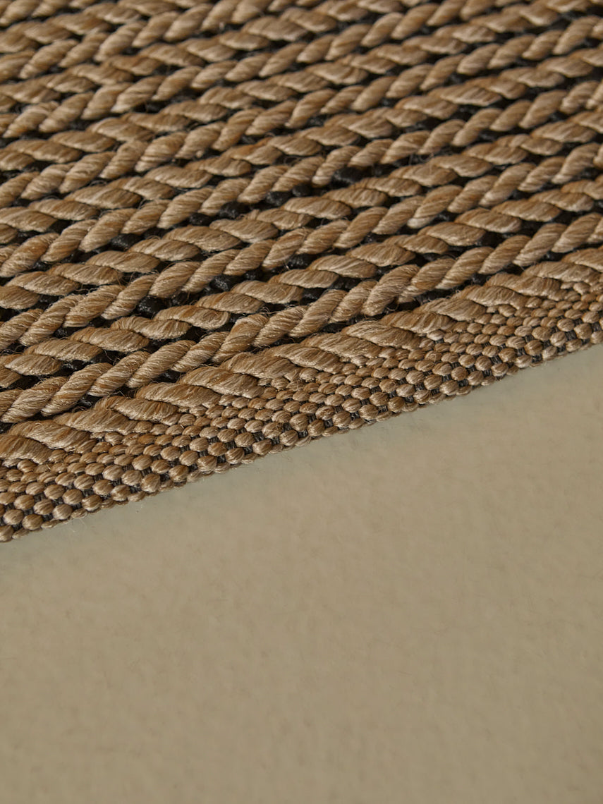 Alfombra artesanal de doble trenzado negro y natural, original de India. Apta tanto para interior como para exterior.