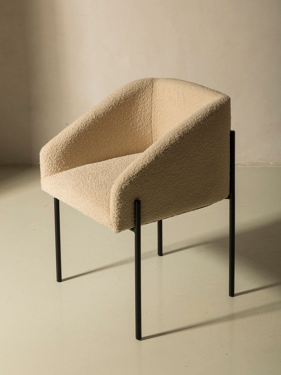 Silla con estructura de hierro negro tapizada en rizo color crema elaborada artesanalmente en Marruecos.