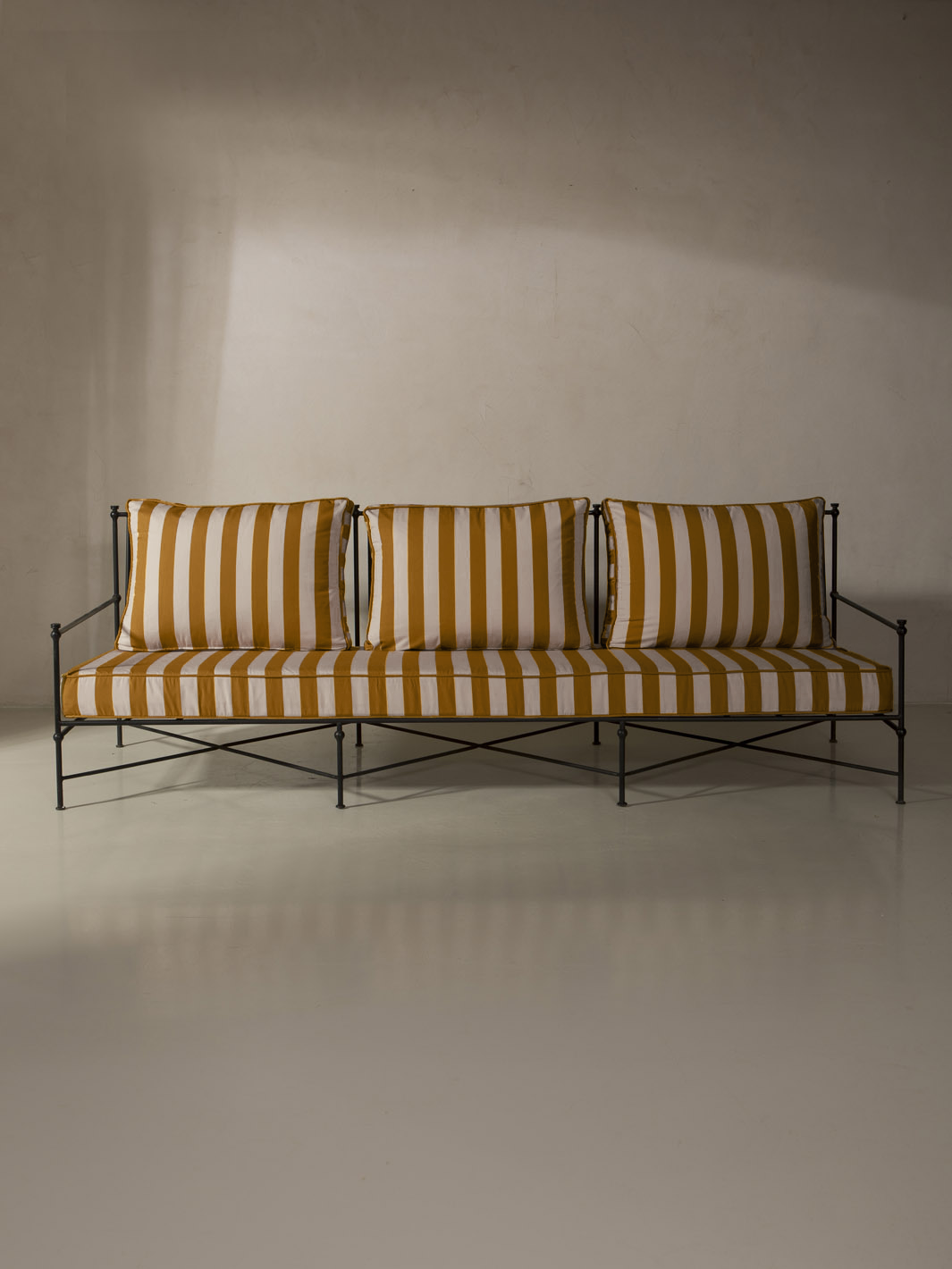 Funda para sofá Medaillon. Confeccionadas en tejido de alta calidad a rayas mostaza y blanco, estas fundas aportan un toque sofisticado y atemporal a cualquier espacio al aire libre. Cada detalle ha sido pensado para ofrecer comodidad sin renunciar al diseño.