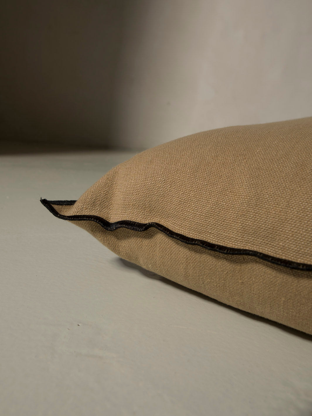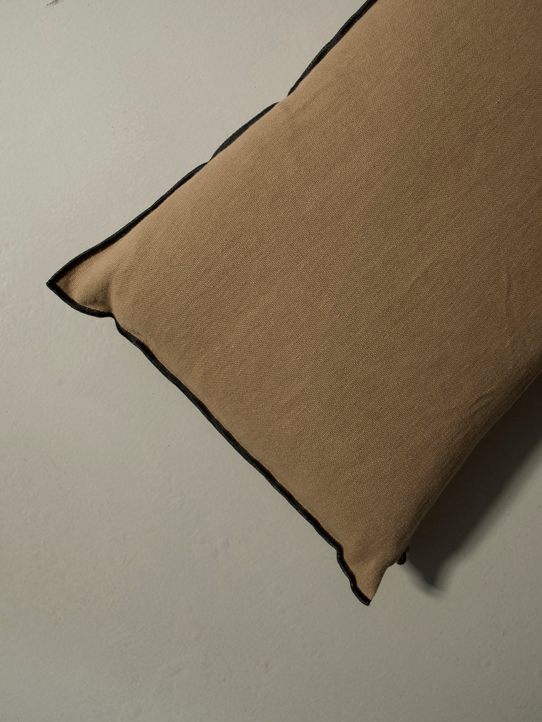 Almohadón de lino en color canela de Maison de Vacances con vivo en negro.