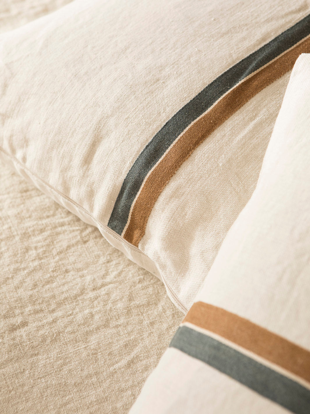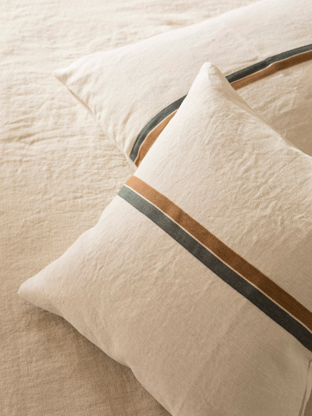 Almohadón de lino natural belga de la firma Libeco con relleno de pluma de pato ligero, con un efecto suave y envolvente. Su agradable tacto y su calidad lo convierten en un complemento ideal para tu salón o dormitorio.