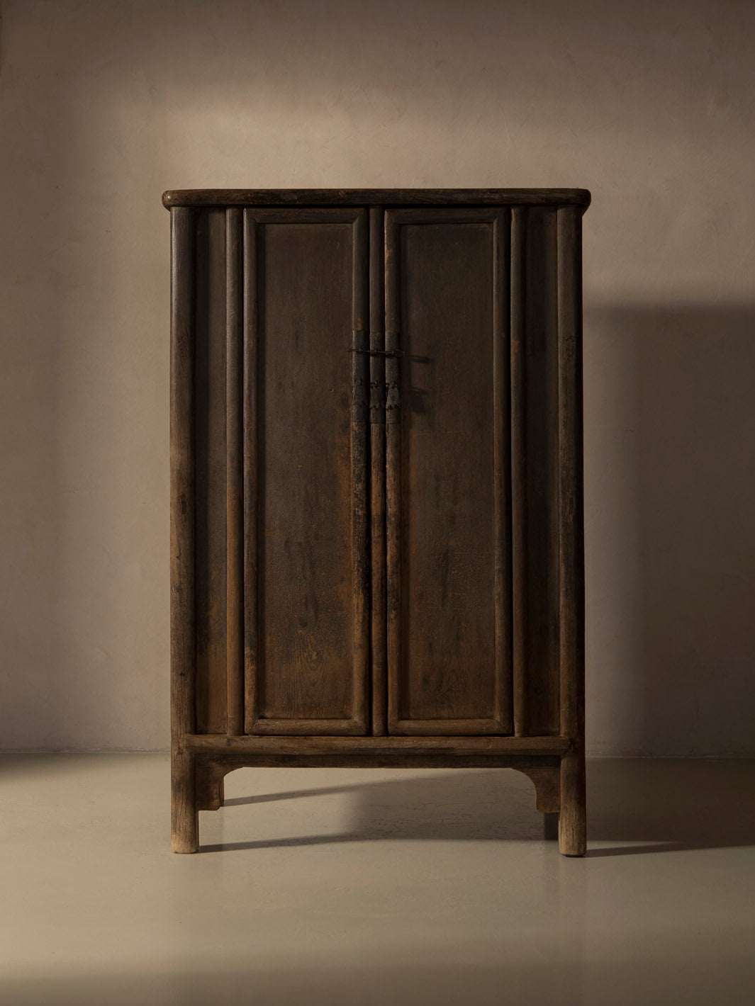 Librería francesa en madera de nogal con cuarterones de raíz de nogal de tonalidad similar al Palisandaro, con cristales soplados originales del siglo XIX y decoraciones de columnas torneadas.
