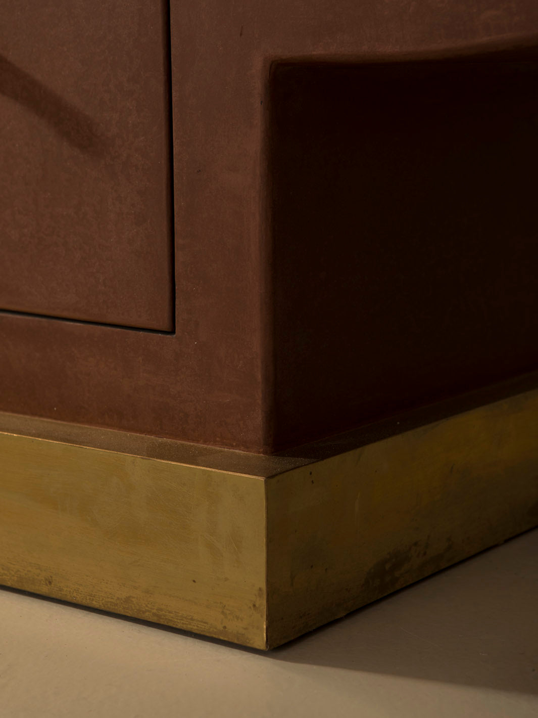 La pieza está construida a partir de 36 capas de tierra fina de Castilla, compactadas y trabajadas para crear una estructura densa y texturizada. La base y los tiradores de los cajones están hechos de latón dorado, simbolizando la conexión con la tierra y la relación con el usuario.