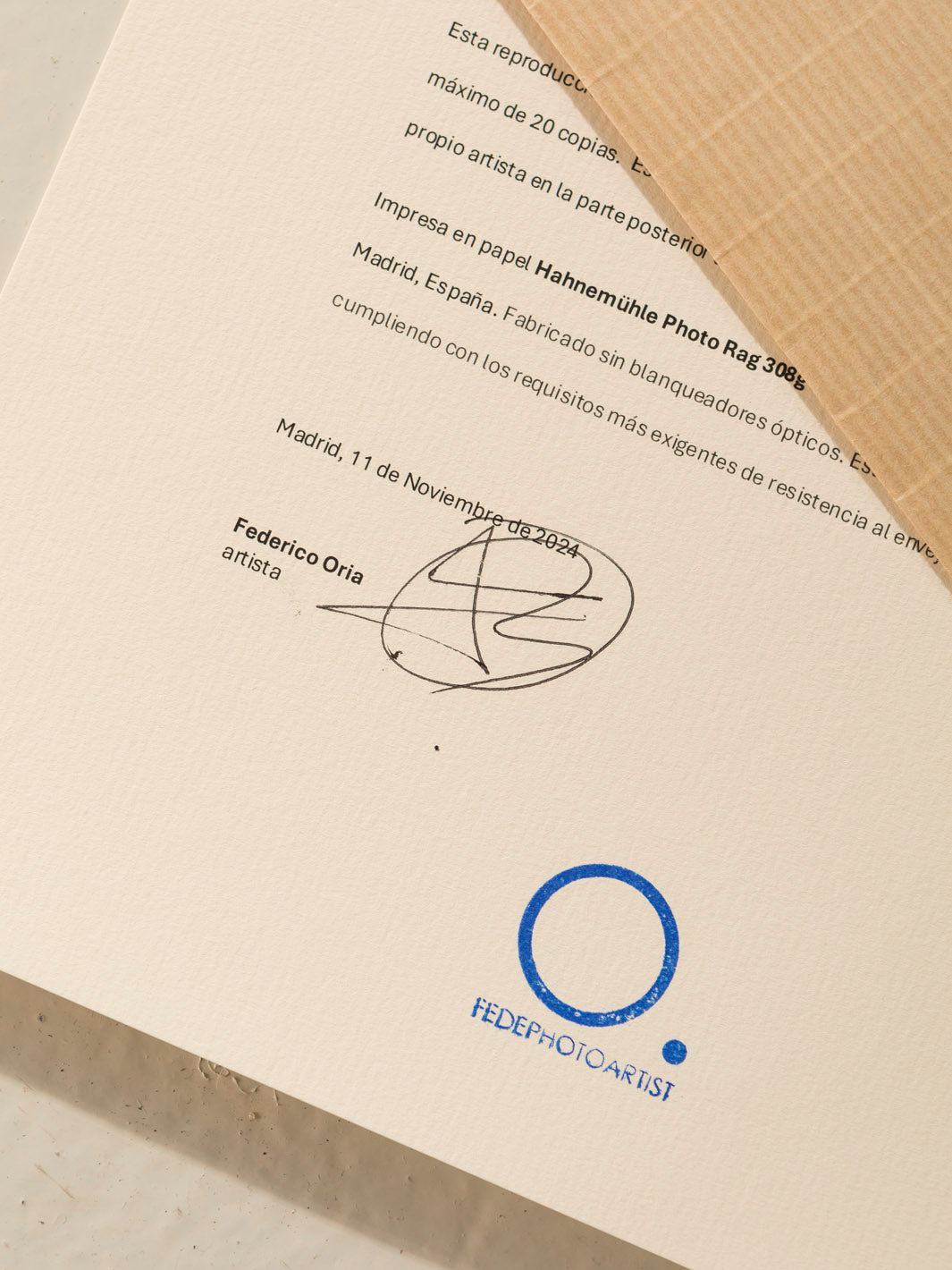 Obras miniatura enmarcadas (22x17) en series limitadas de 20 reproducciones, numeradas y firmadas. Cada obra se entrega con certificado de autenticidad de Federico Oria.