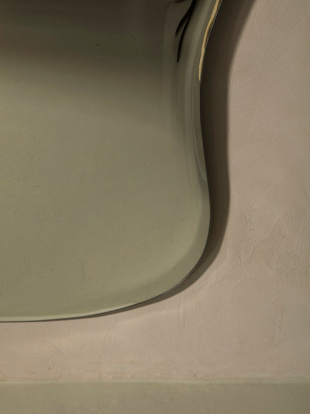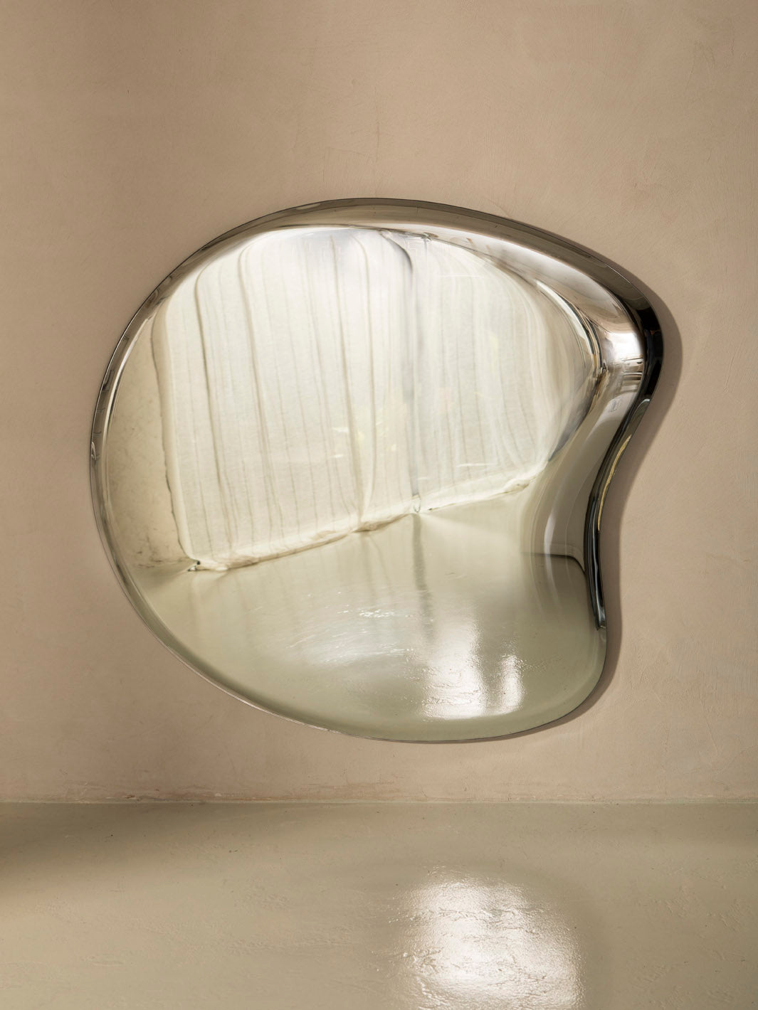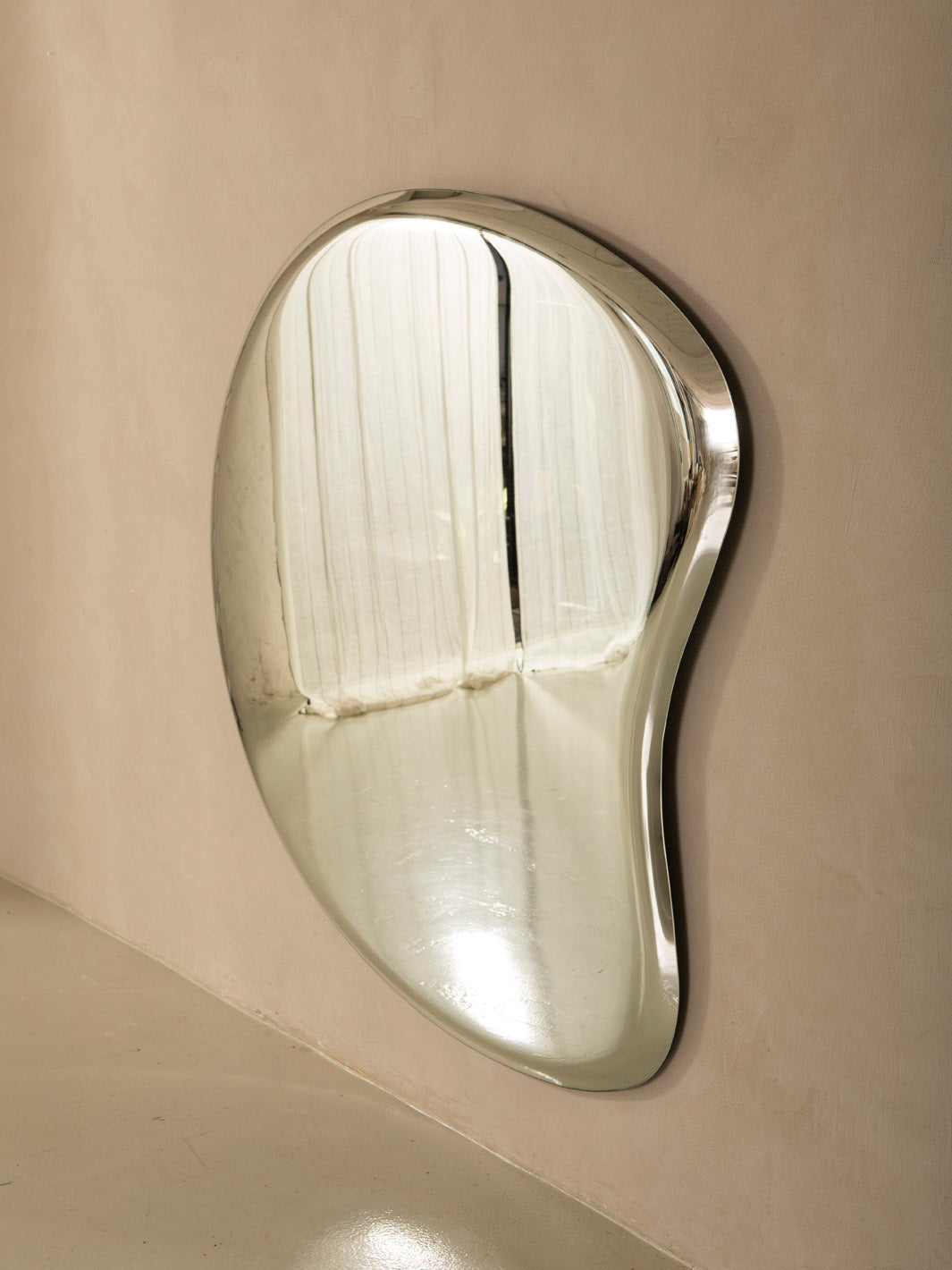 Espejo italiano de Mercurio cóncavo, con un diseño orgánico. Una pieza única que aporta profundidad y elegancia a cualquier espacio.