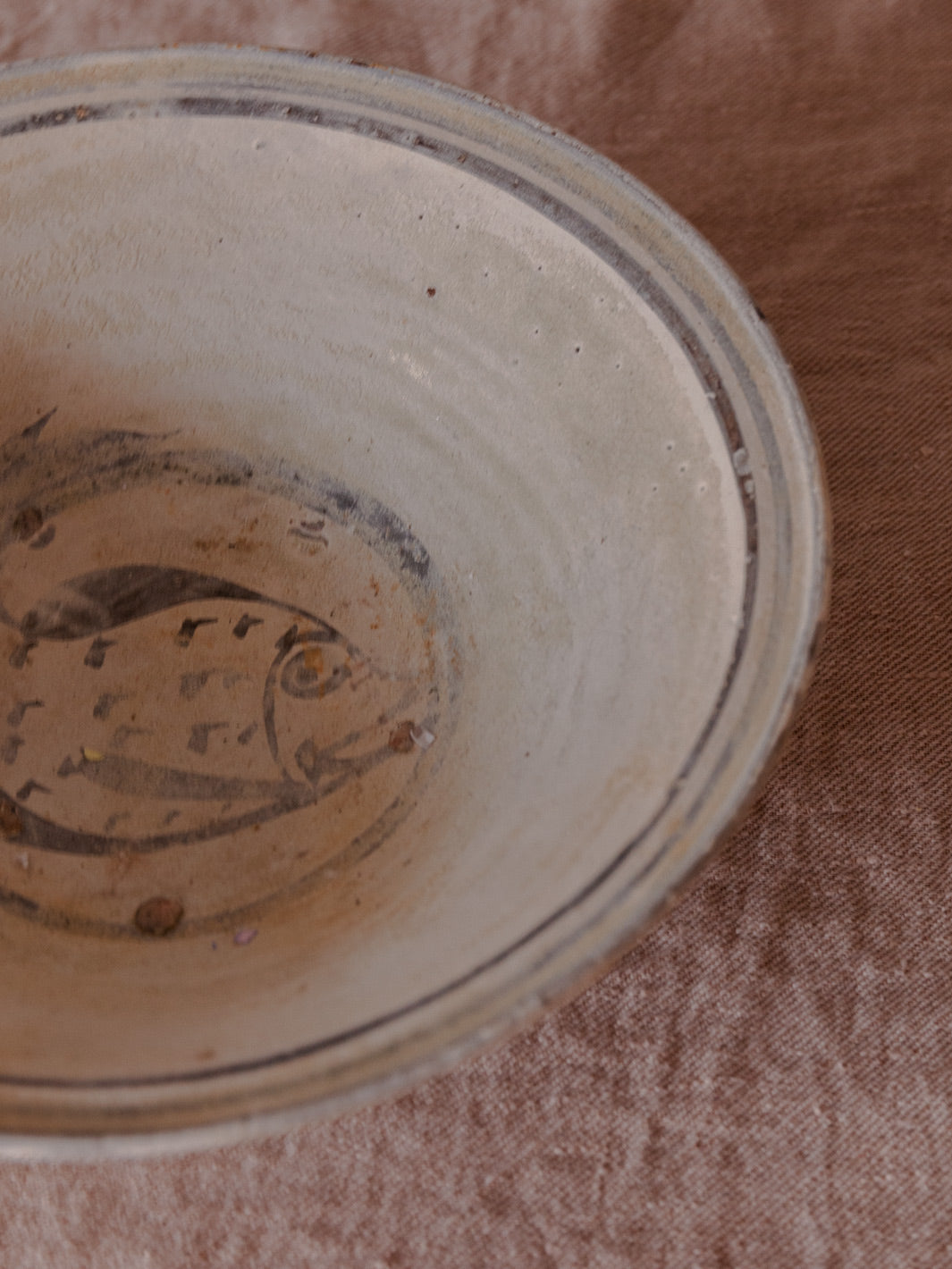 Plato de cerámica original de Indonesia del s.XVI con detalle de carpa pintada a mano en color antracita. Una obra de arte rescatada del fondo del mar.