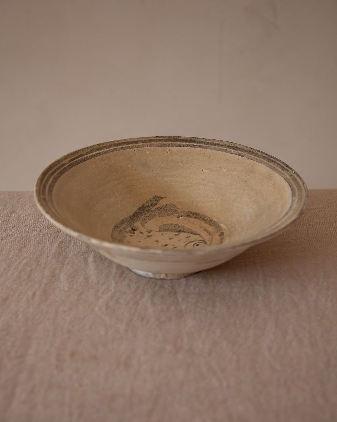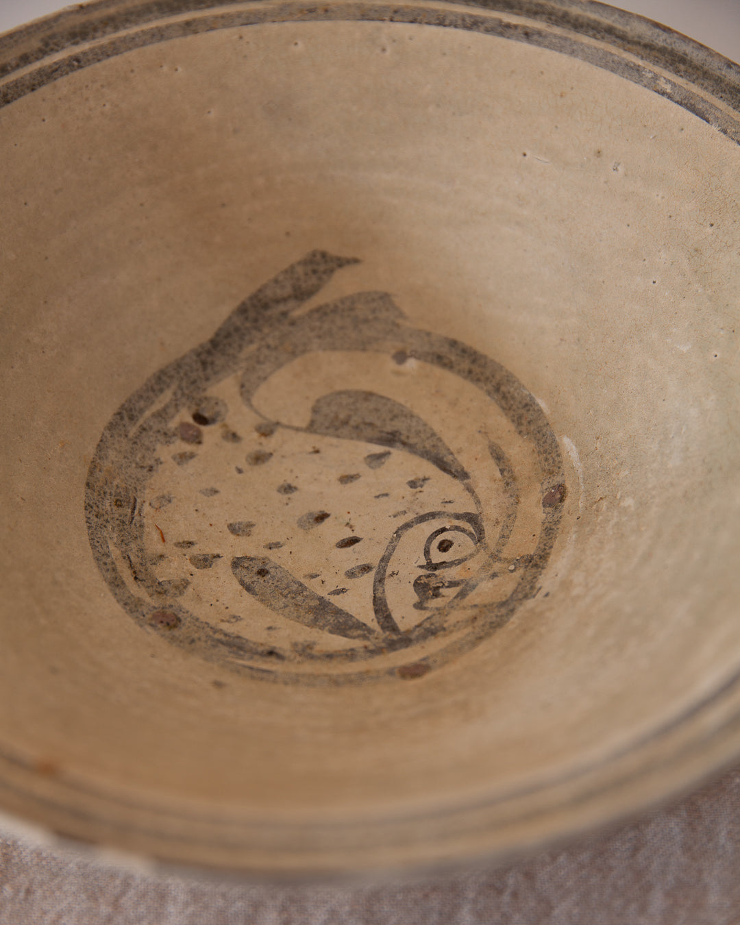 Plato de cerámica original de Indonesia del s.XVI con detalle de carpa pintada a mano en color antracita. Una obra de arte rescatada del fondo del mar.