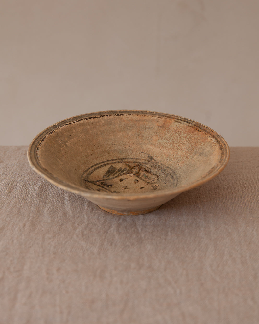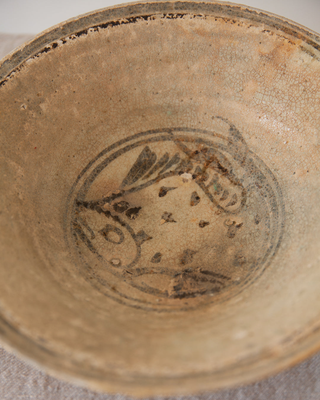 Plato de cerámica original de Indonesia del s.XVI con detalle de carpa pintada a mano en color antracita. Una obra de arte rescatada del fondo del mar.