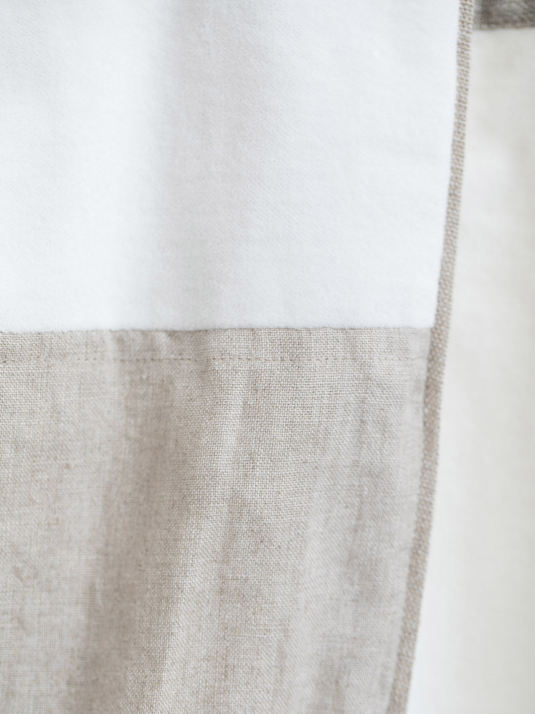 Cortina de terciopelo de algodón en color blanco con parte inferior y vivo en lino 100% de color crudo. El precio incluye una caída de cortina y anillas.