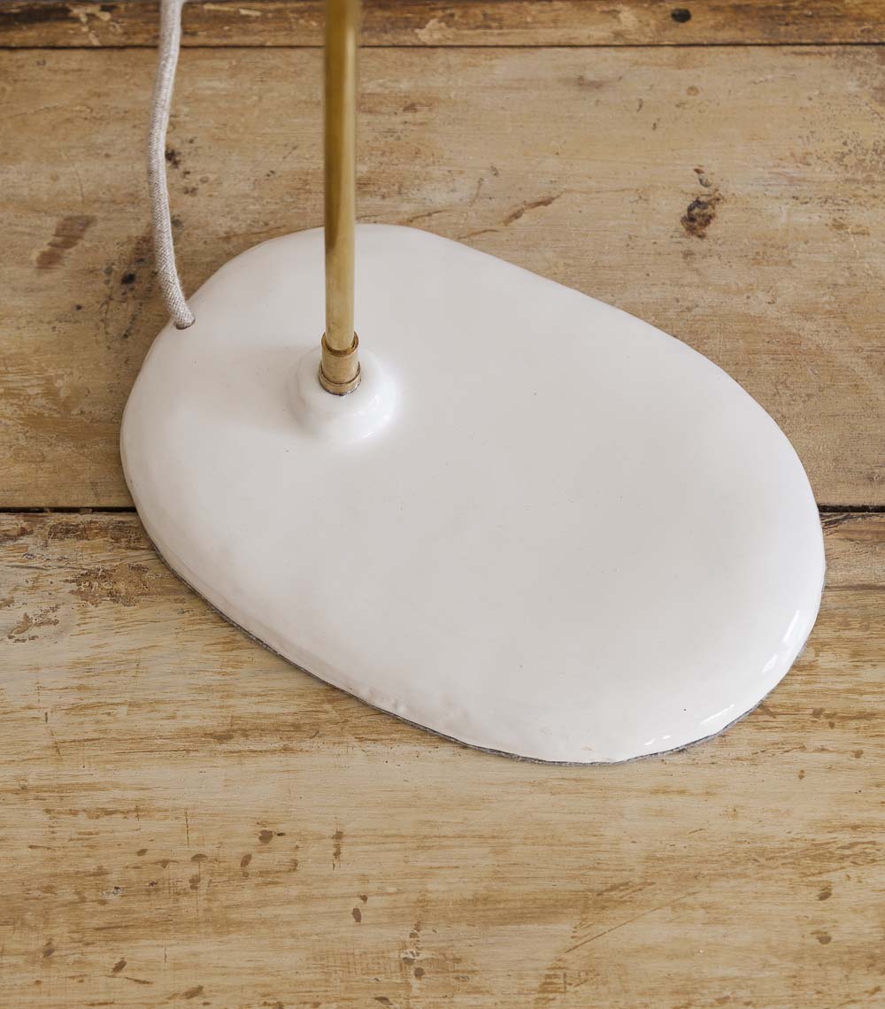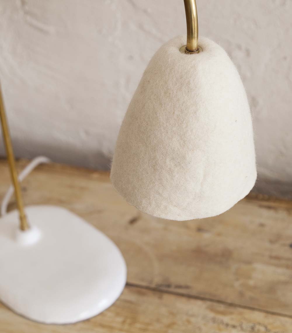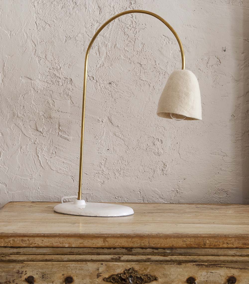 Lámpara de sobremesa francesa con pantalla de fieltro, vástago de latón y pie de loza esmaltado en blanco. Está inspirada en el "qelesh", un sombrero tradicional usado por los hombres en la Albania rural, cada pantalla está hecha artesanalmente con la laboriosa técnica tradicional.