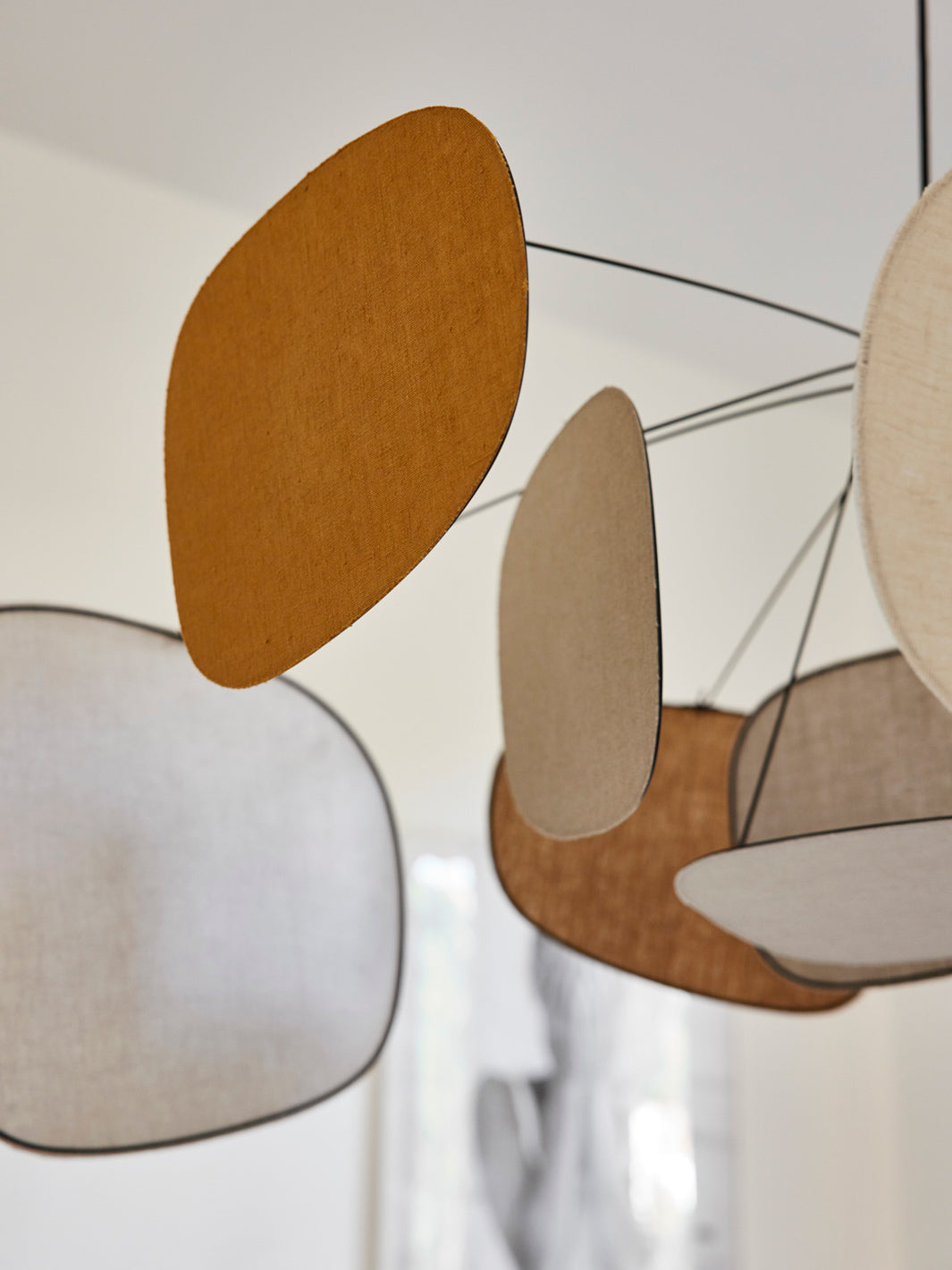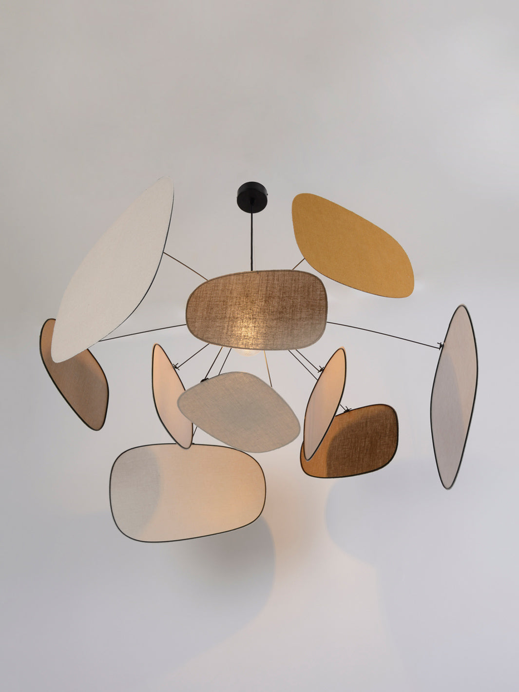 Escultórica lámpara de techo de lino y metal pintado. Inspirada en los años 70 se distingue por su particular forma y colores propias esculturas móviles de la época. Está formada por 10 biombos lino ribeteados en tela. La luz se deja entrever entre el lino con el cordón textil creando un juego de luz especialmente decorativo.