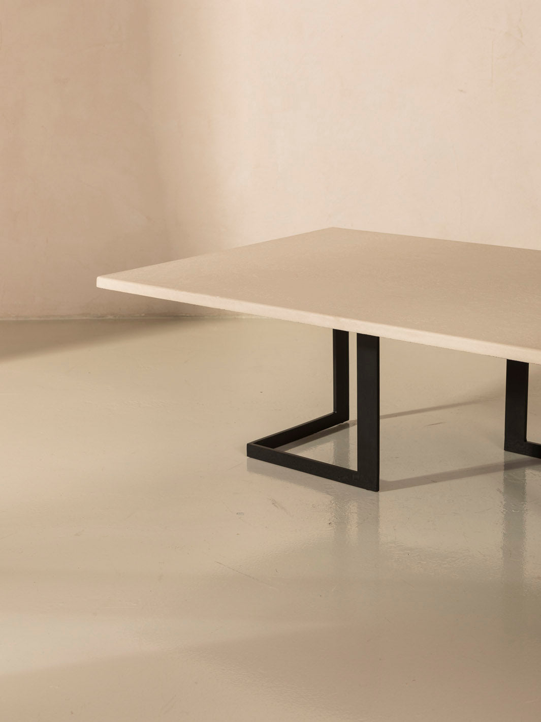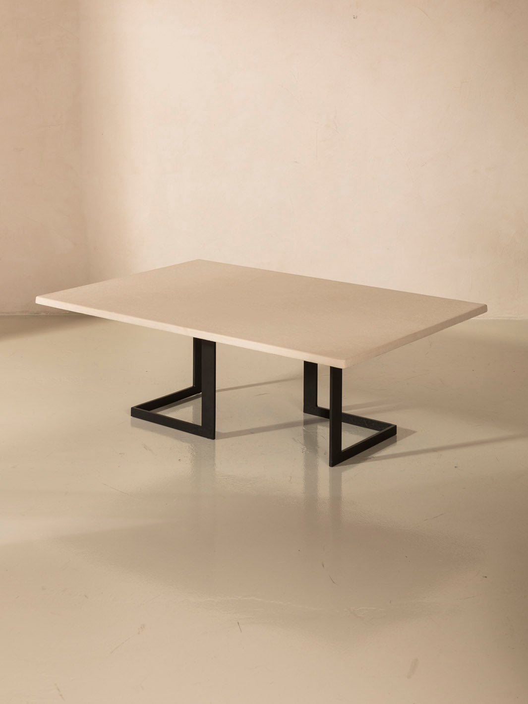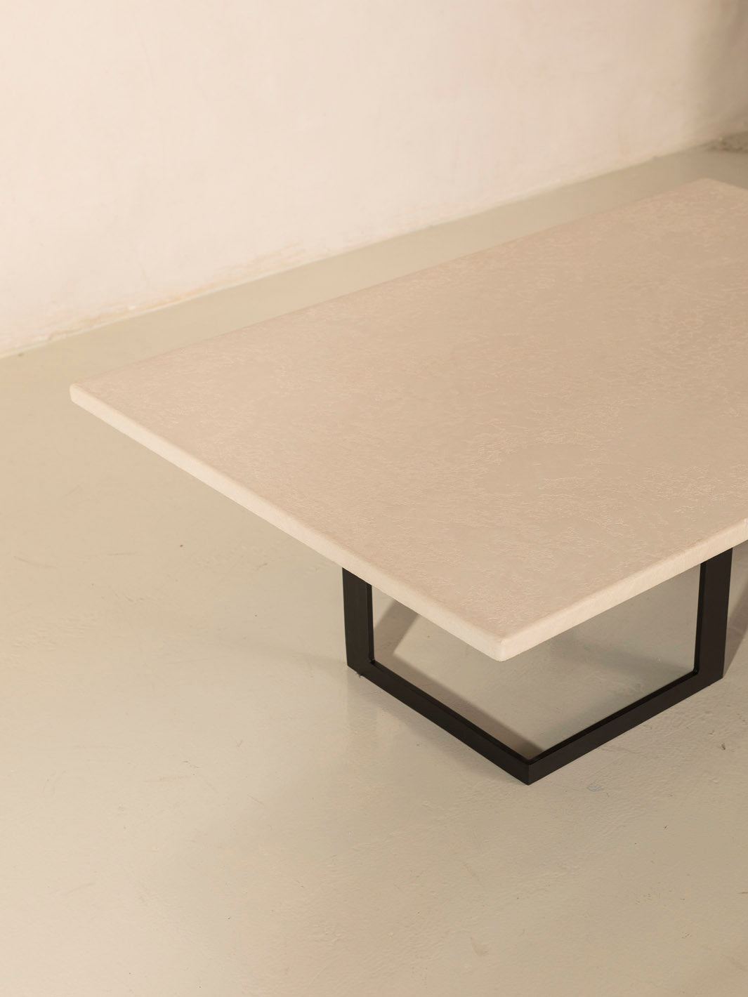 Mesa cuadrada de argilita de color Rope y estructura de metal reciclado negro. La argilita es una roca sedimentaria compuesta por arcilla y cuarzo.