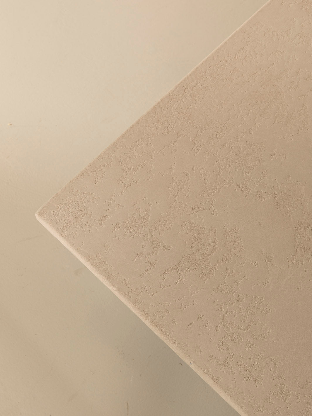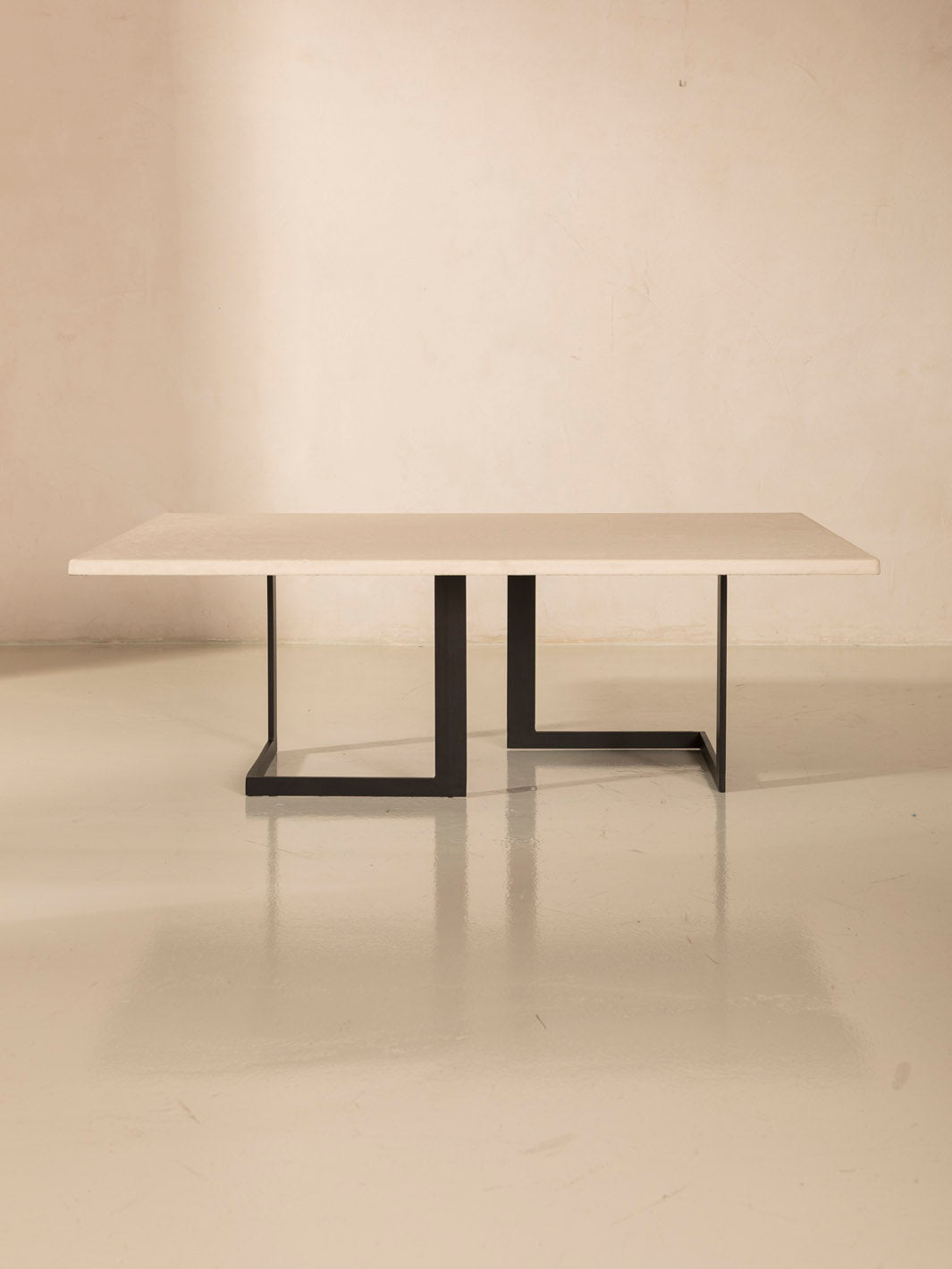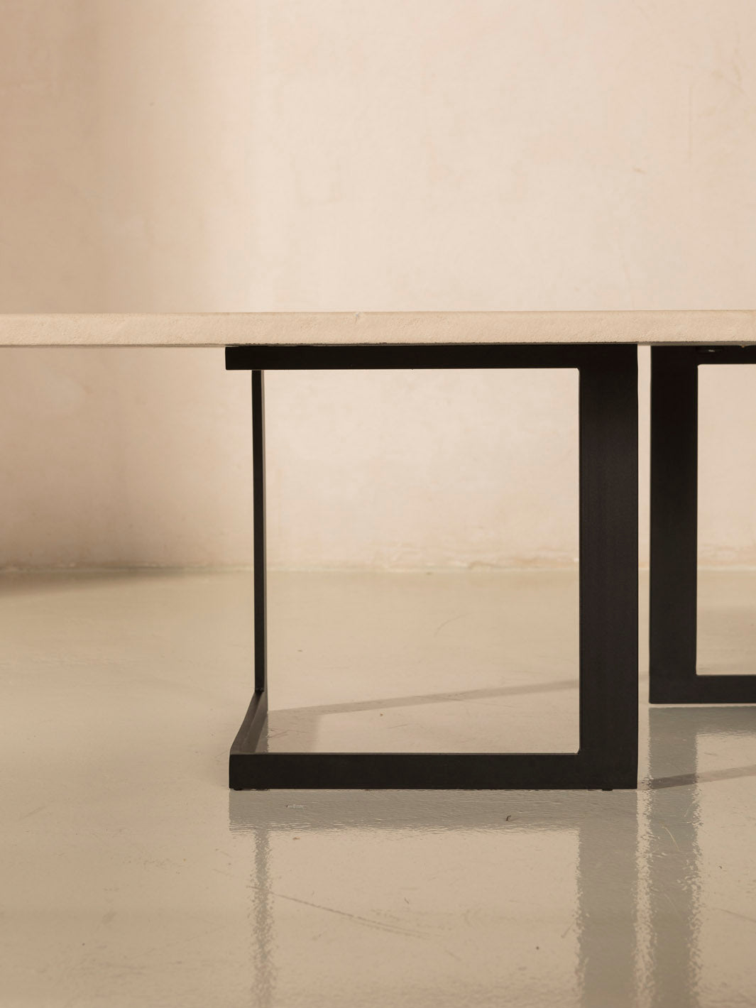 Mesa cuadrada de argilita de color Rope y estructura de metal reciclado negro. La argilita es una roca sedimentaria compuesta por arcilla y cuarzo.