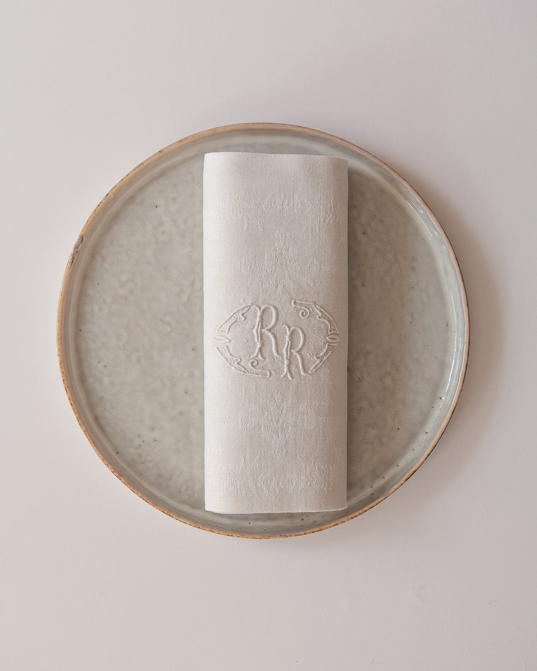 Juego de 4 servilletas de Damasco francés original de los años 20 en color violeta con las iniciales RR bordadas a mano.