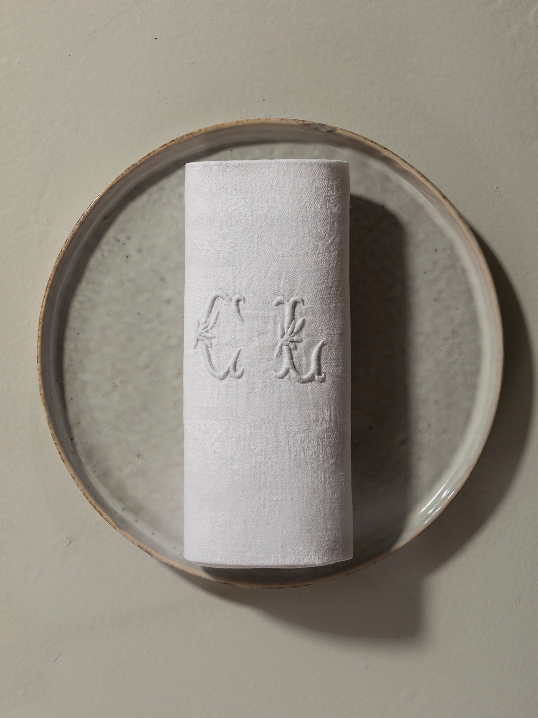 Juego de 9 servilletas de Damasco francés original de los años 20 en color blanco con las iniciales CL bordadas a mano.