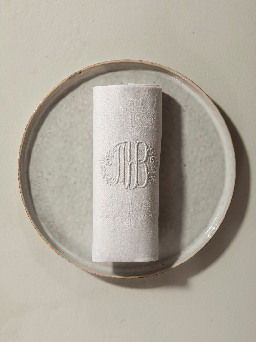 Juego de 12 servilletas de Damasco francés original de los años 20 en color blanco con las iniciales MB bordadas a mano.
