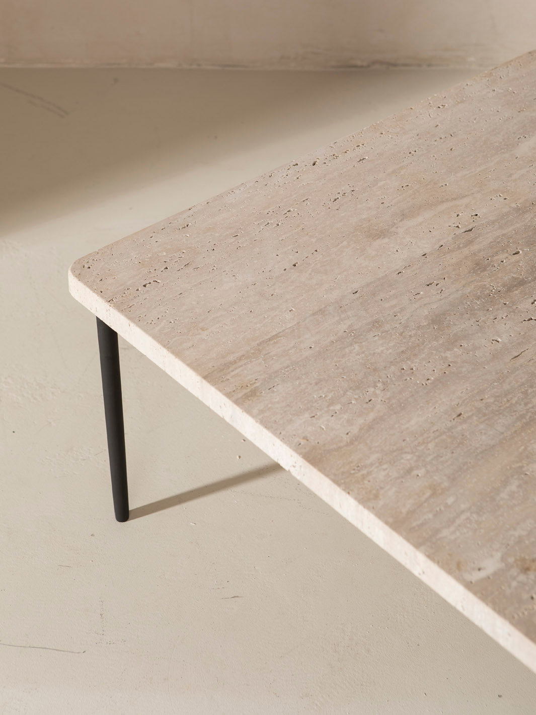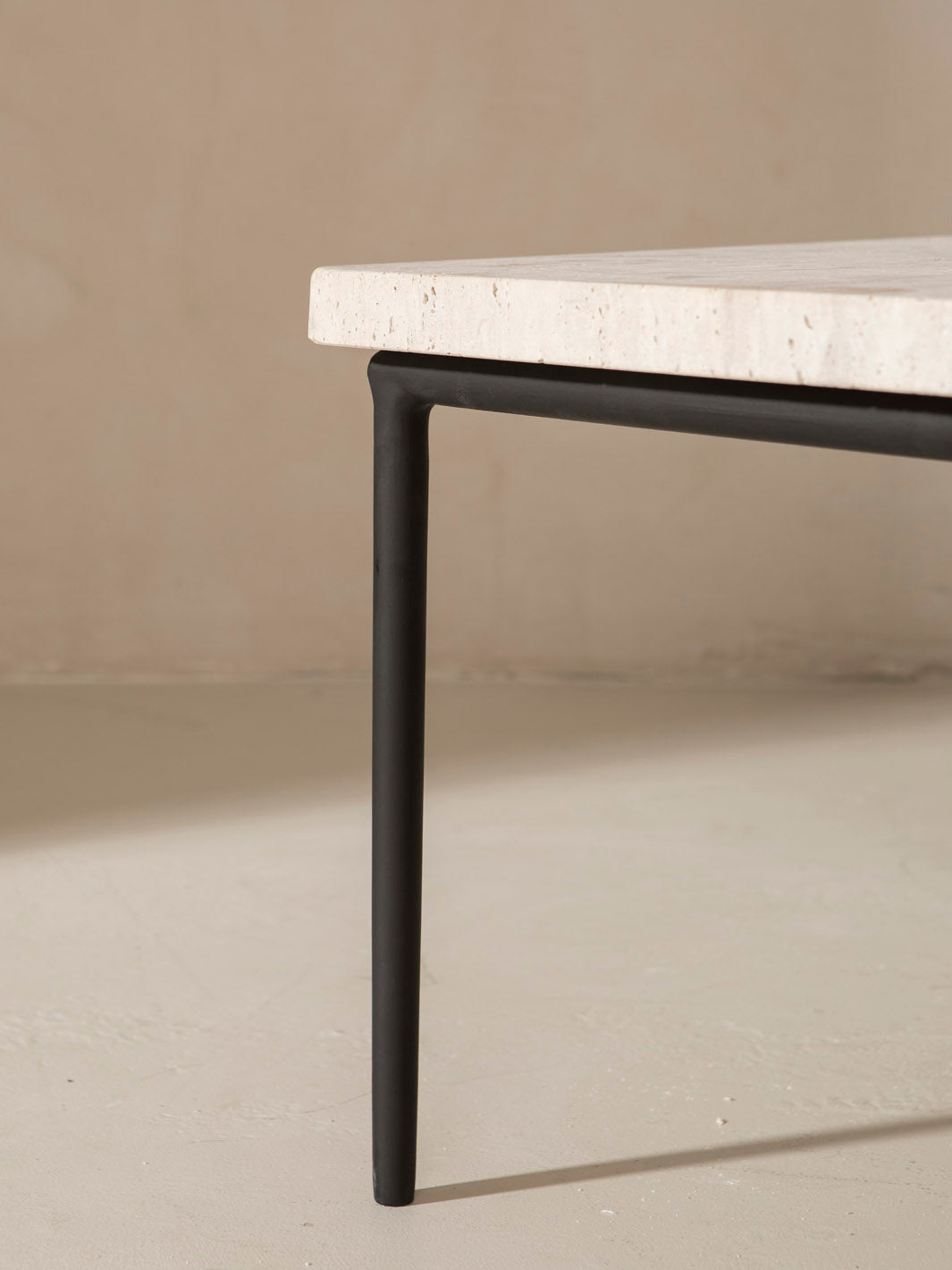 Mesa en travertino bruto sobre estructura en hierro termolacado. Una pieza perfecta tanto para interior como exterior. Al tratarse de una pieza trabajada a mano puede contener ligeras irregularidades e imperfecciones propias de su proceso de creación artesanal.