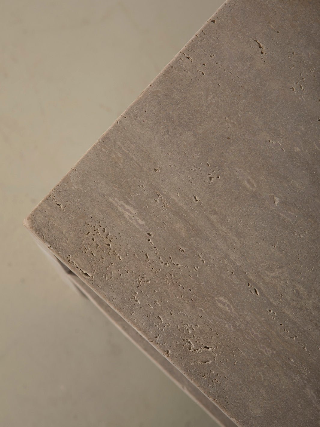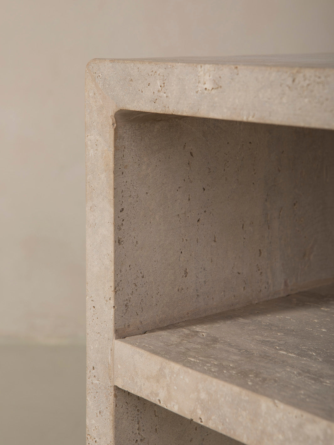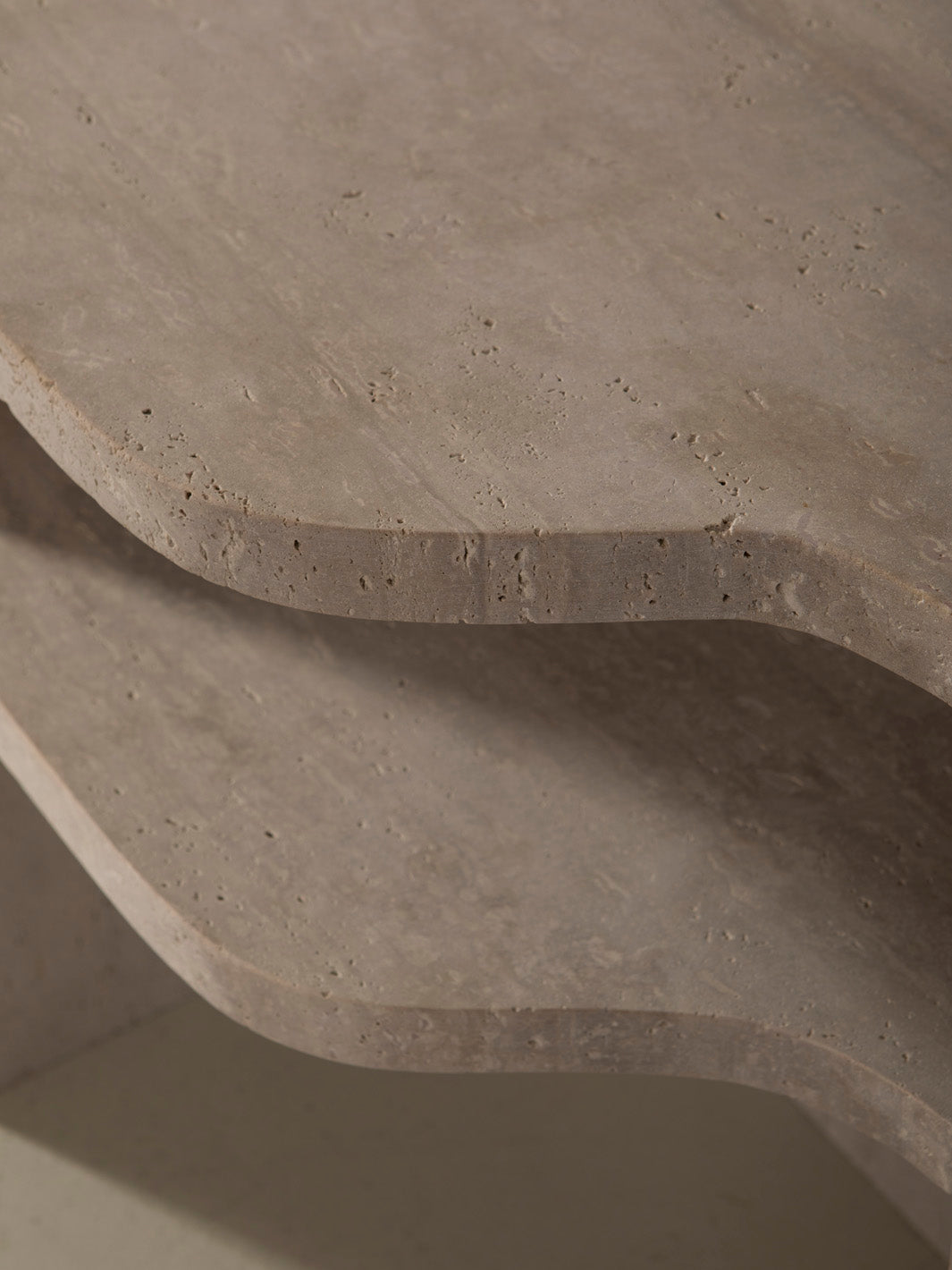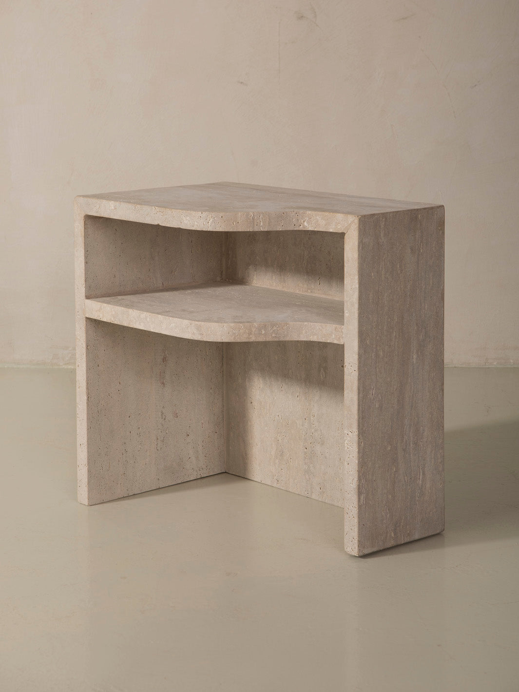 Concebida como una pieza de diseño escultórico, esta mesilla de travertino tallada a mano combina la nobleza de la piedra natural con una forma orgánica y fluida. Su silueta ondulada aporta dinamismo y ligereza visual, contrastando con la solidez del material, mientras que su estante integrado añade funcionalidad sin restar pureza al diseño. Cada mesilla es única, con vetas y texturas irrepetibles que celebran la imperfección de lo natural.