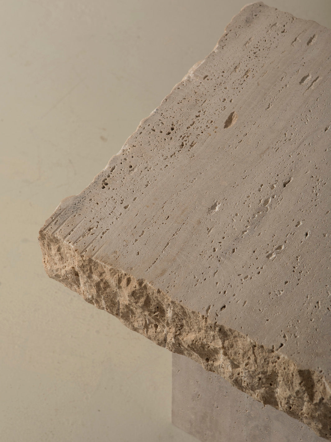 Esta mesa auxiliar de travertino, elaborada artesanalmente, es una auténtica pieza escultórica que fusiona funcionalidad y arte. Su diseño geométrico y simétrico resalta la belleza natural de la piedra, con vetas y texturas únicas que hacen de cada unidad una obra irrepetible.