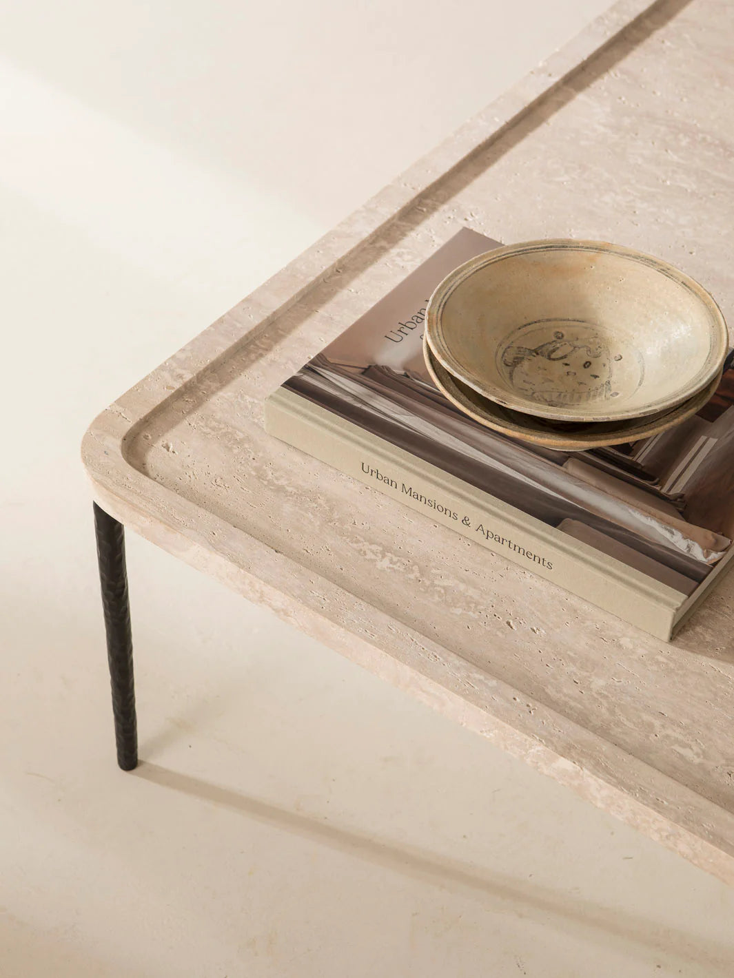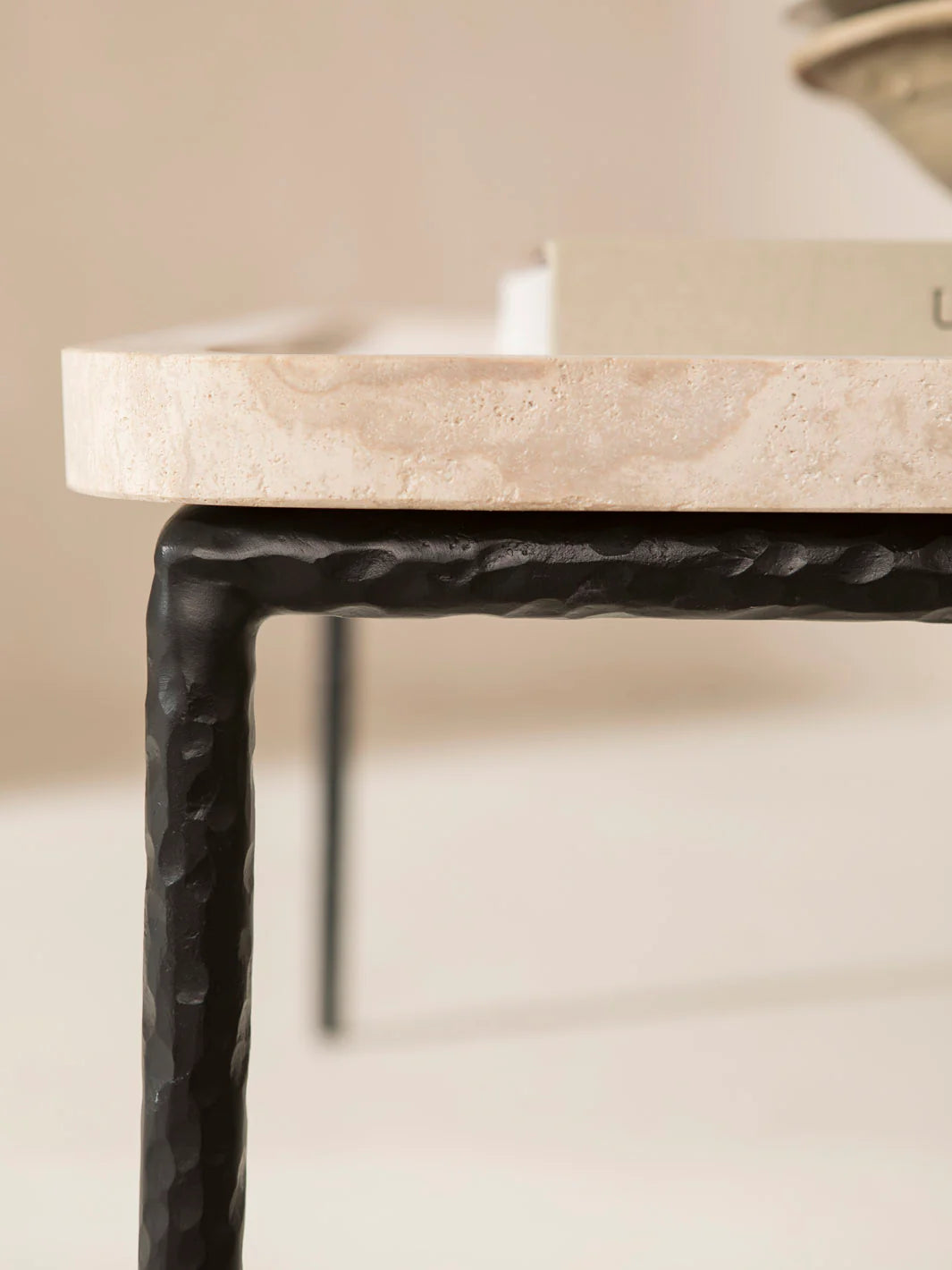 Mesa en travertino bruto escalonado sobre estructura en hierro martelé termolacado. Una pieza perfecta tanto para interior como exterior. Al tratarse de una pieza trabajada a mano puede contener ligeras irregularidades e imperfecciones propias de su proceso de creación artesanal.