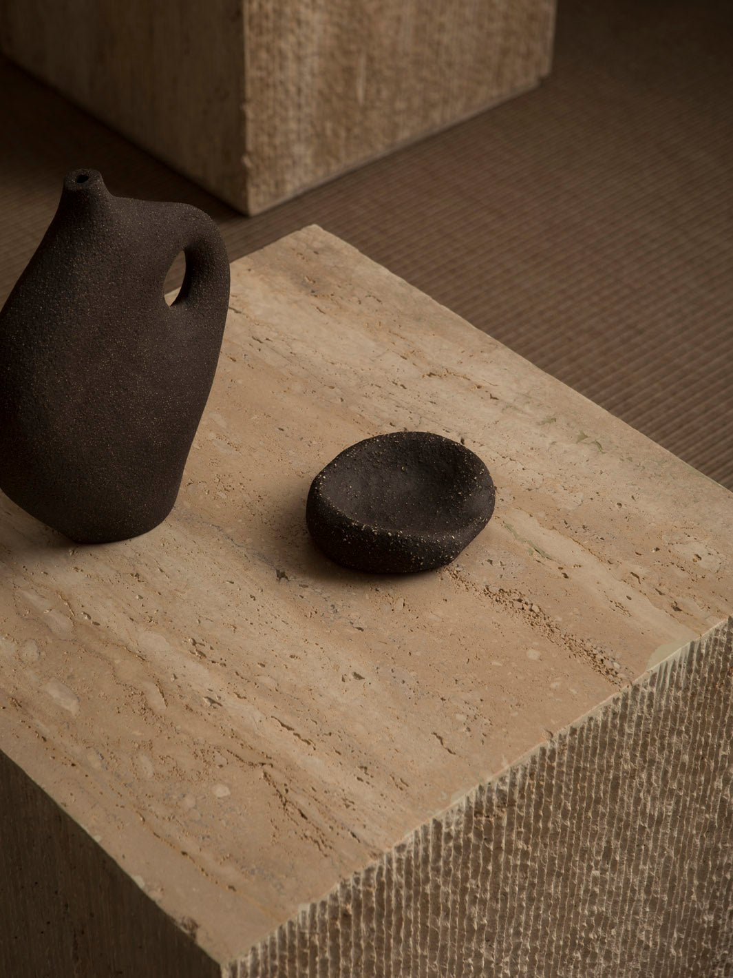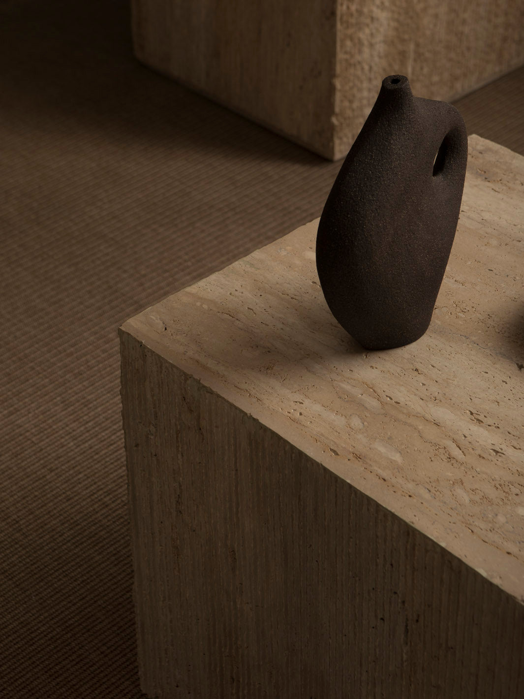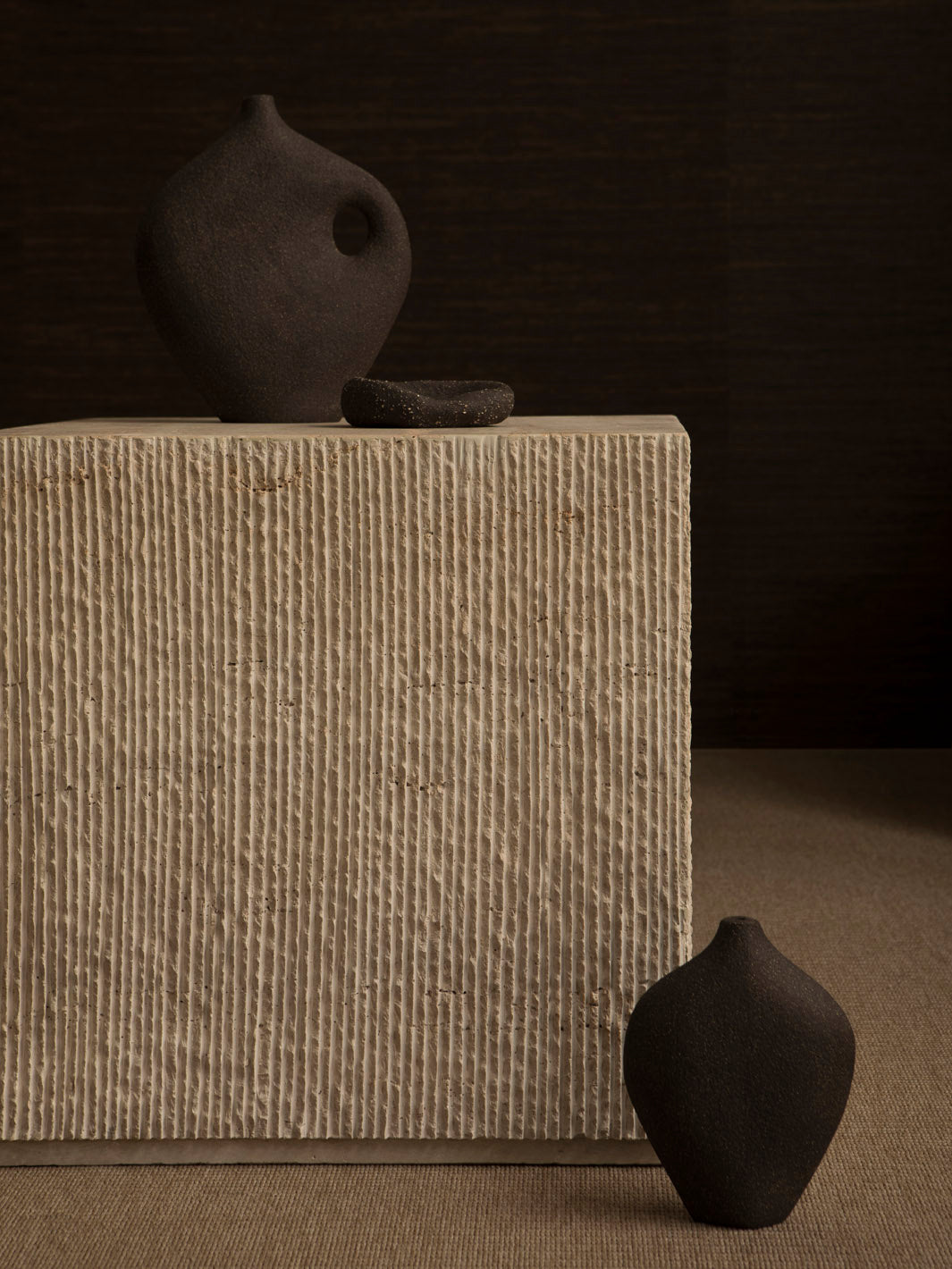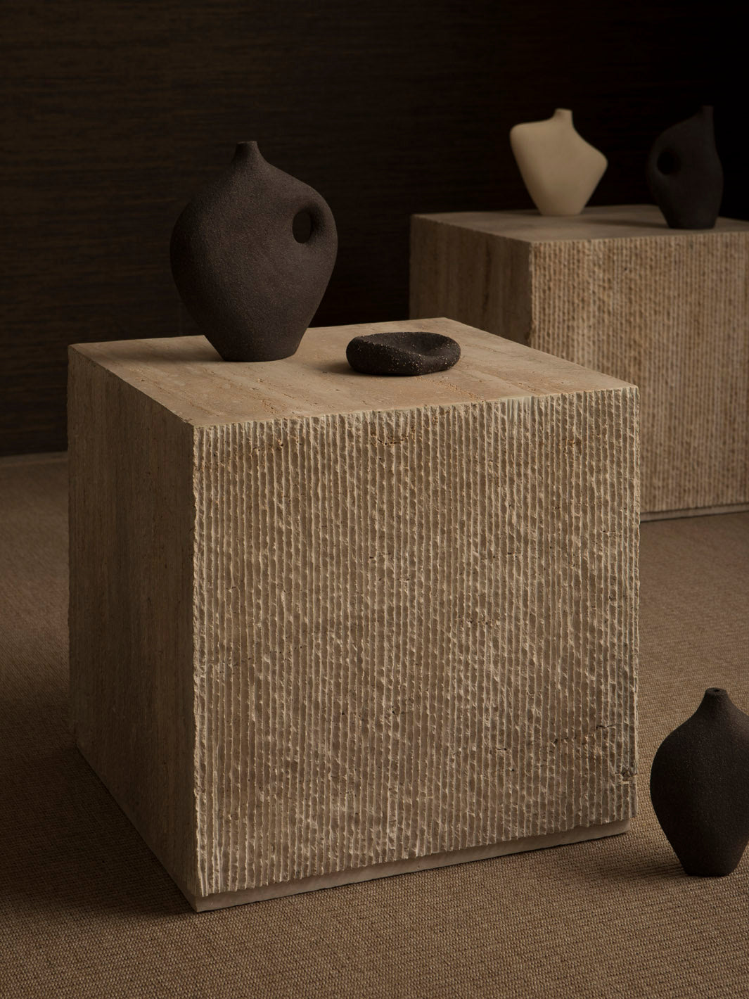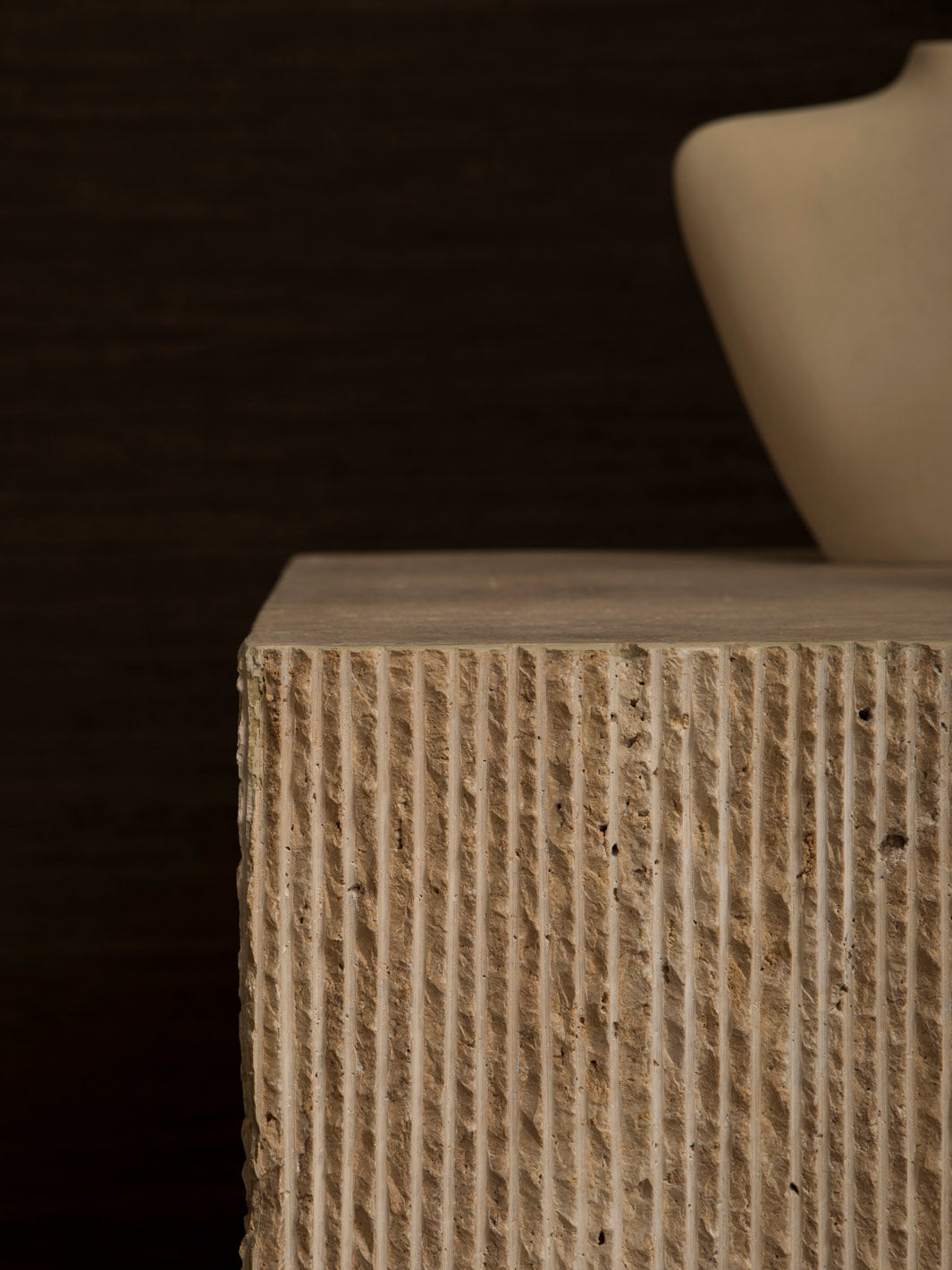 Esta columna de travertino encarna una elegancia atemporal gracias a su textura rica y sus líneas depuradas. Fabricada en piedra natural, presenta un acabado delicadamente trabajado que realza la belleza orgánica del material. Su diseño geométrico, sencillo y robusto, aporta una dimensión escultórica a su interior.