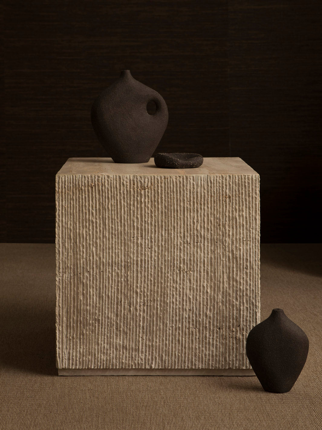 Mesas con forma redondeada de argilita y estructura de metal reciclado negro. La argilita es una roca sedimentaria compuesta por arcilla y cuarzo.