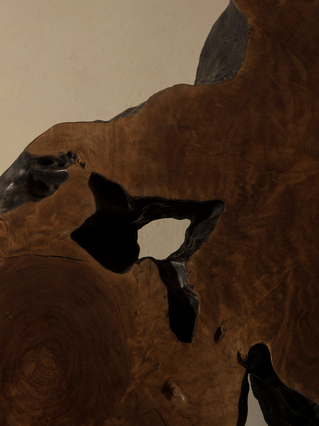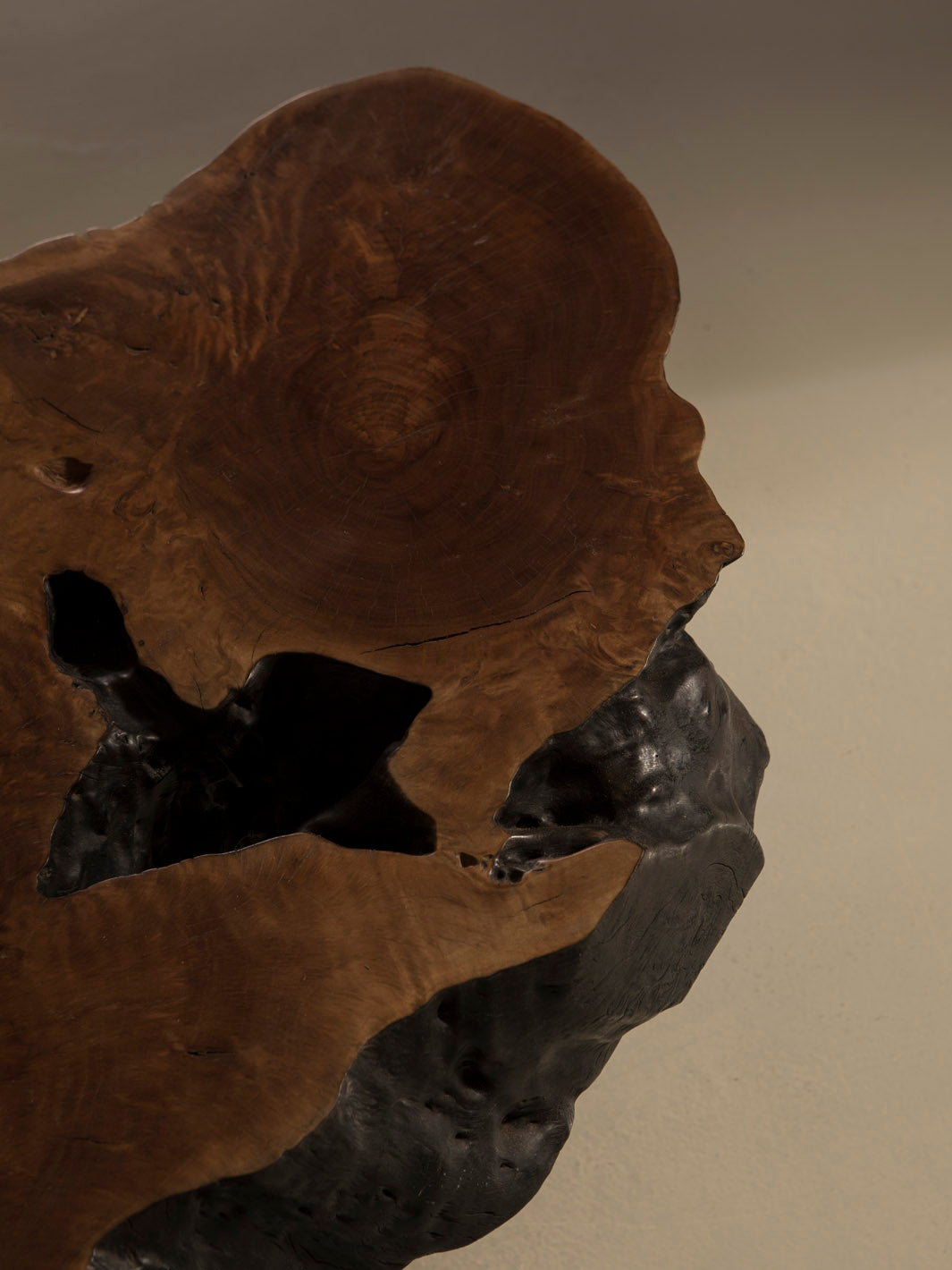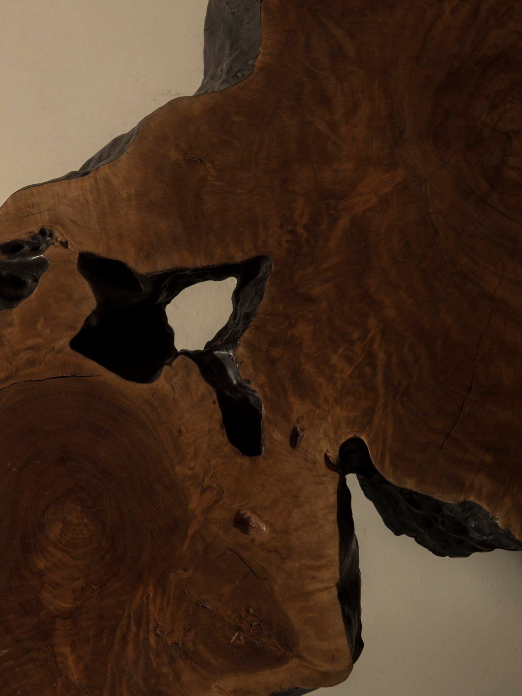 Mesa de centro brutalista trabajada en madera de mango carbonizada y sobre pulido, original de Indonesia.