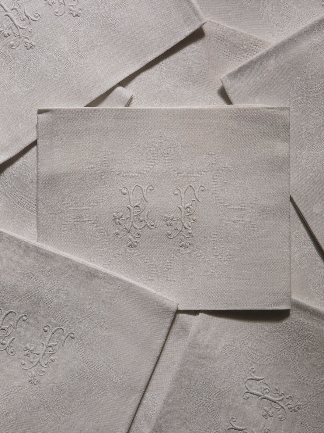 Damascos recuperados y linos naturales protagonizan las mesas más especiales. Las servilletas de hilo de damasco pertenecieron a ajuares de principios de siglo entre los años 20 y 40,