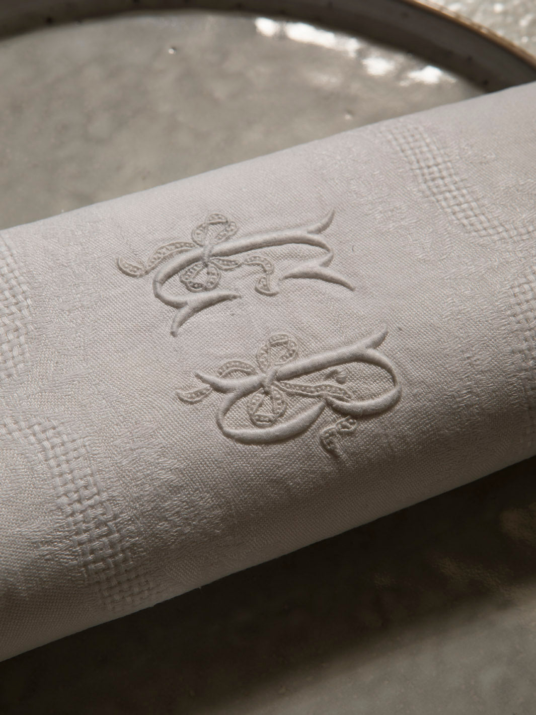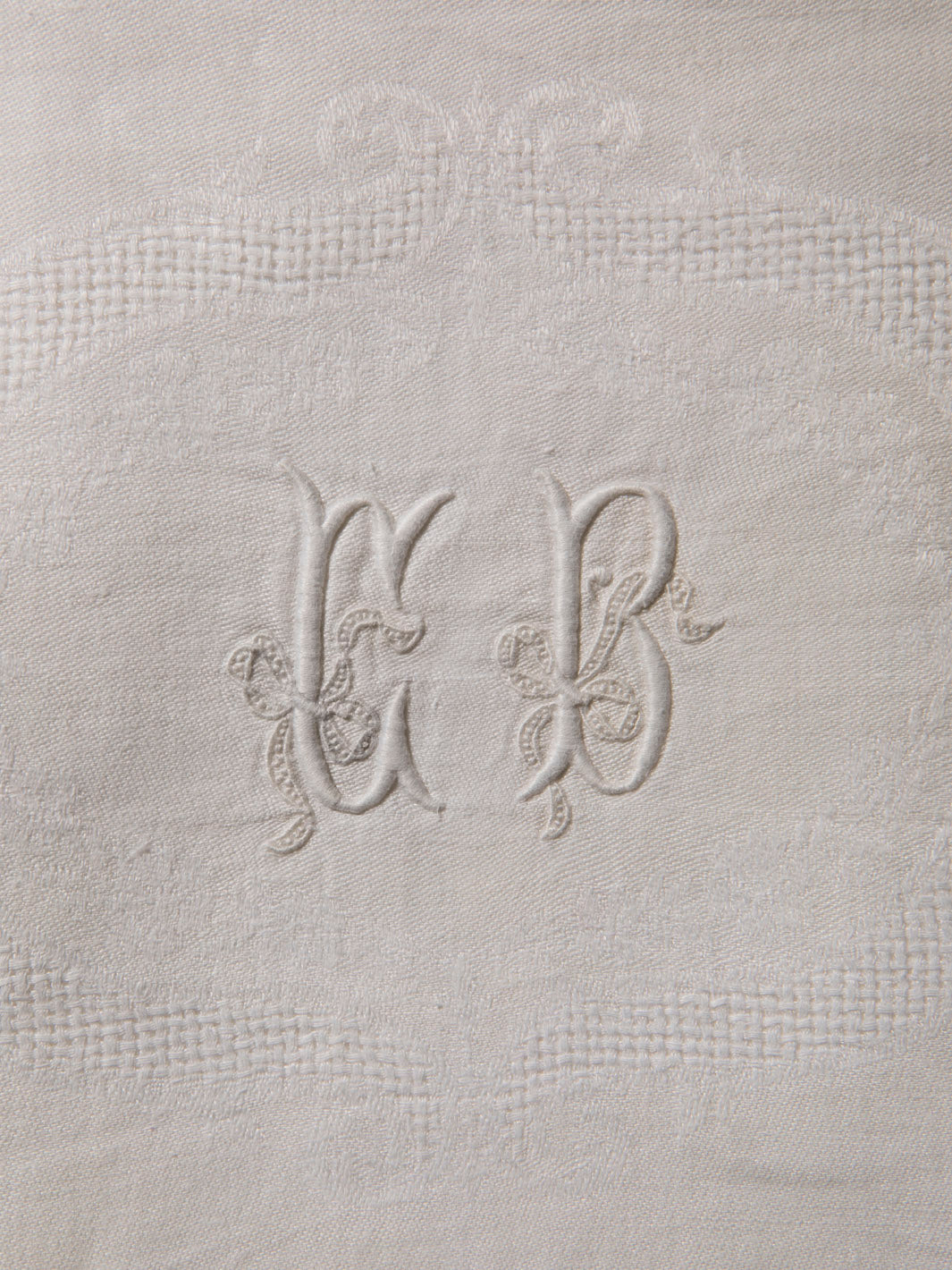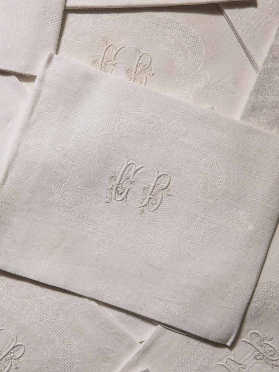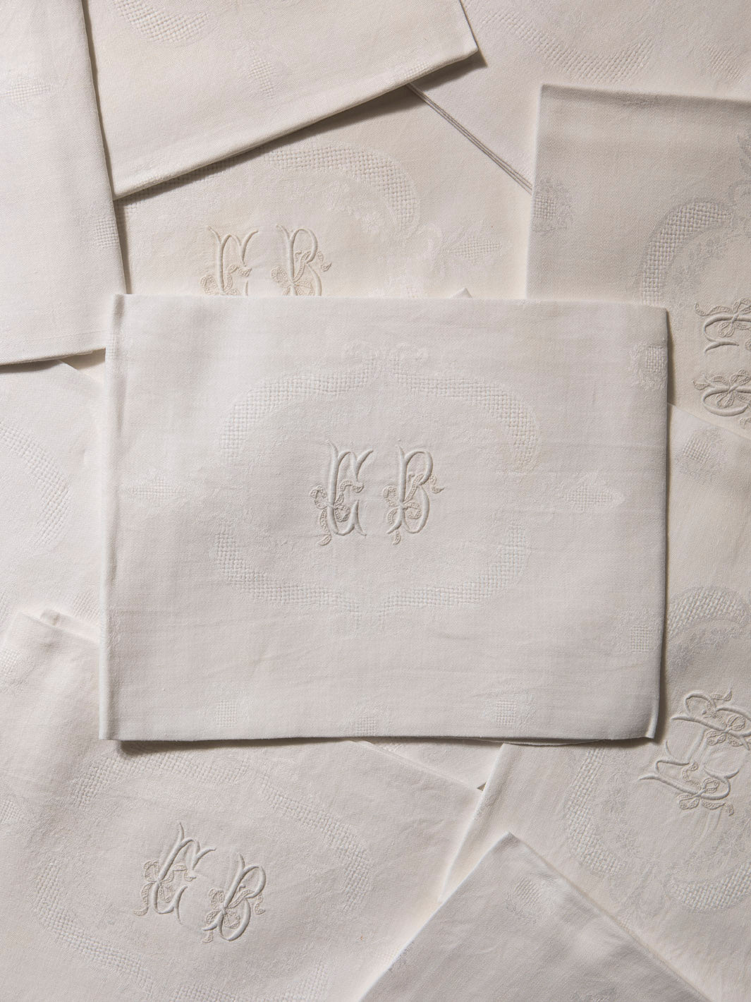 Juego de 10 servilletas de Damasco francés original de los años 20 en color blanco desgastado con las iniciales CB bordadas a mano.