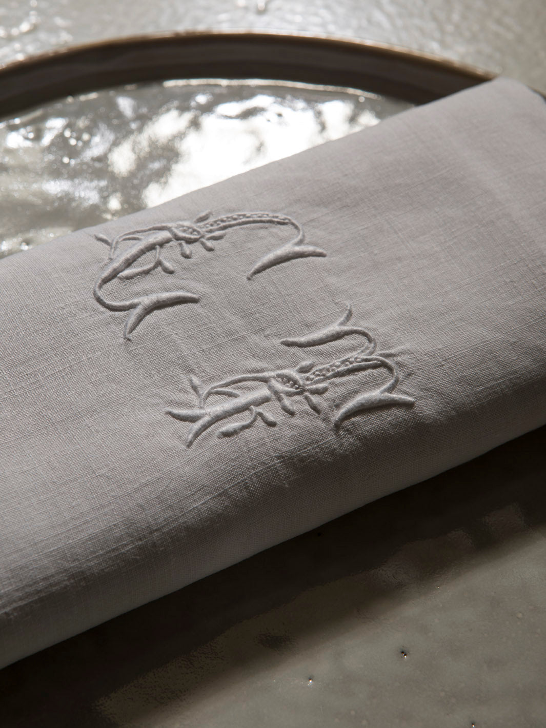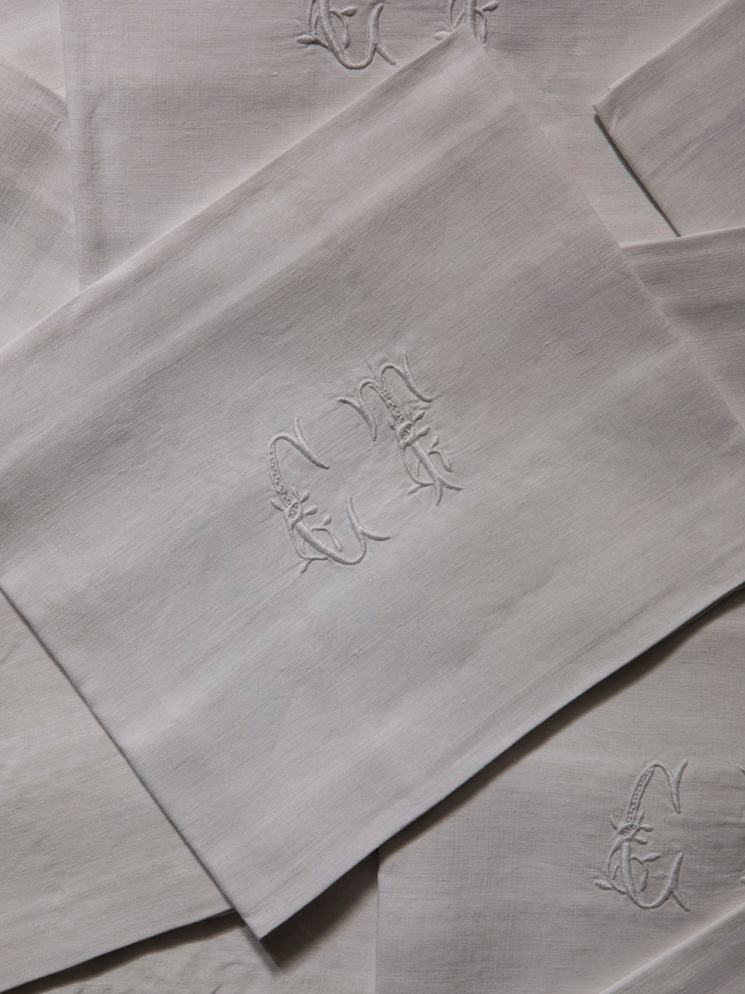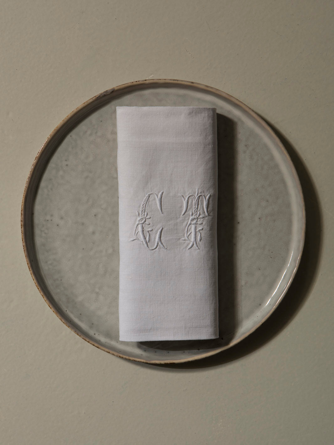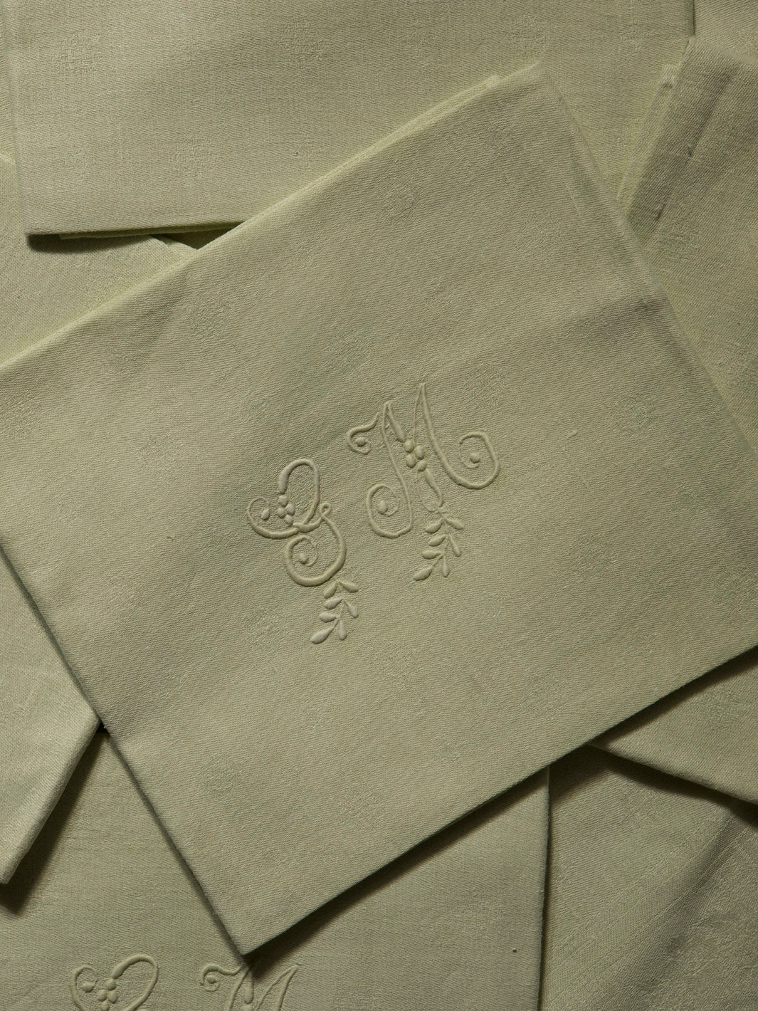Juego de 12 servilletas de Damasco francés original de los años 20 en color blanco desgastado con las iniciales CT bordadas a mano.