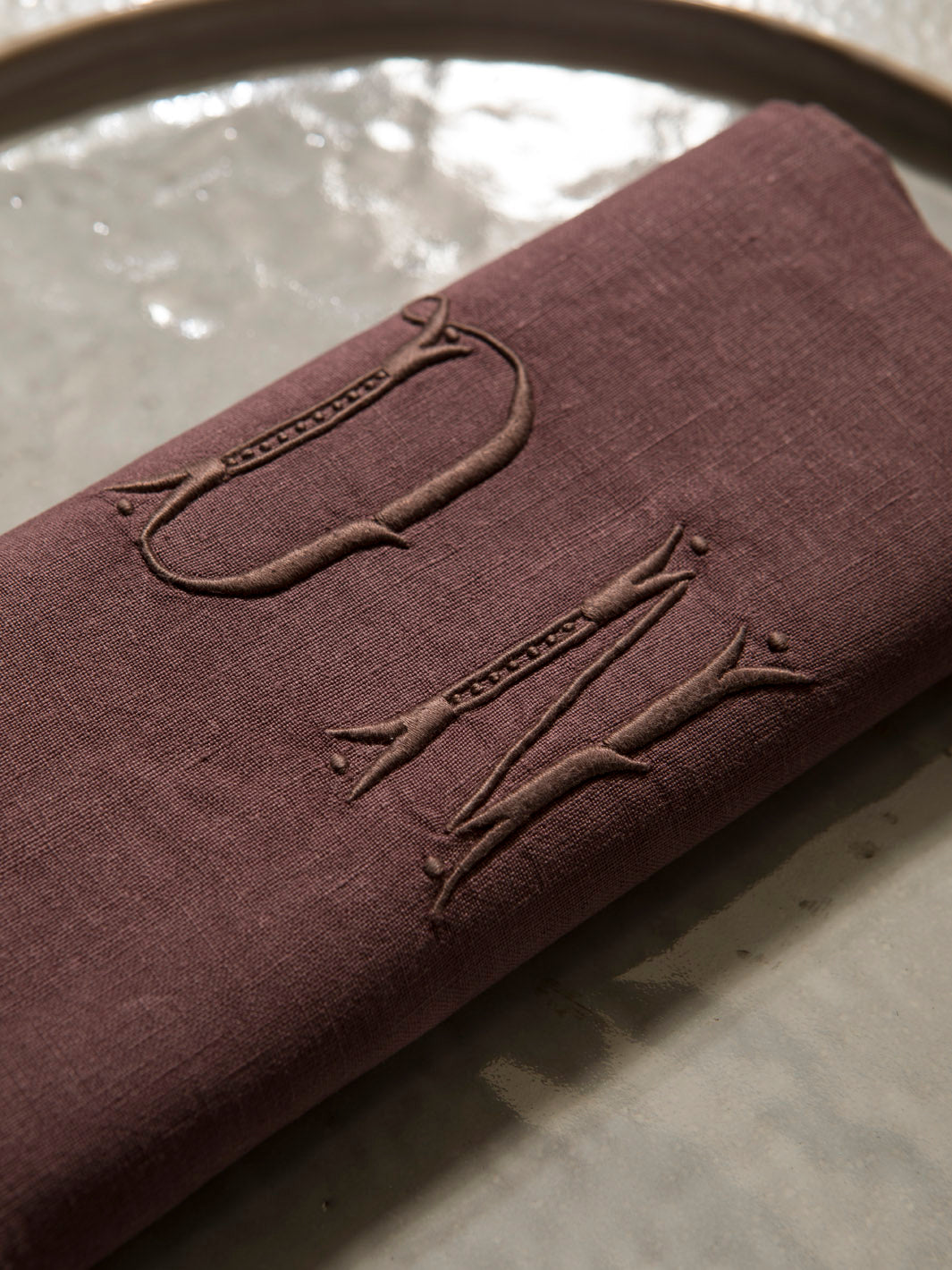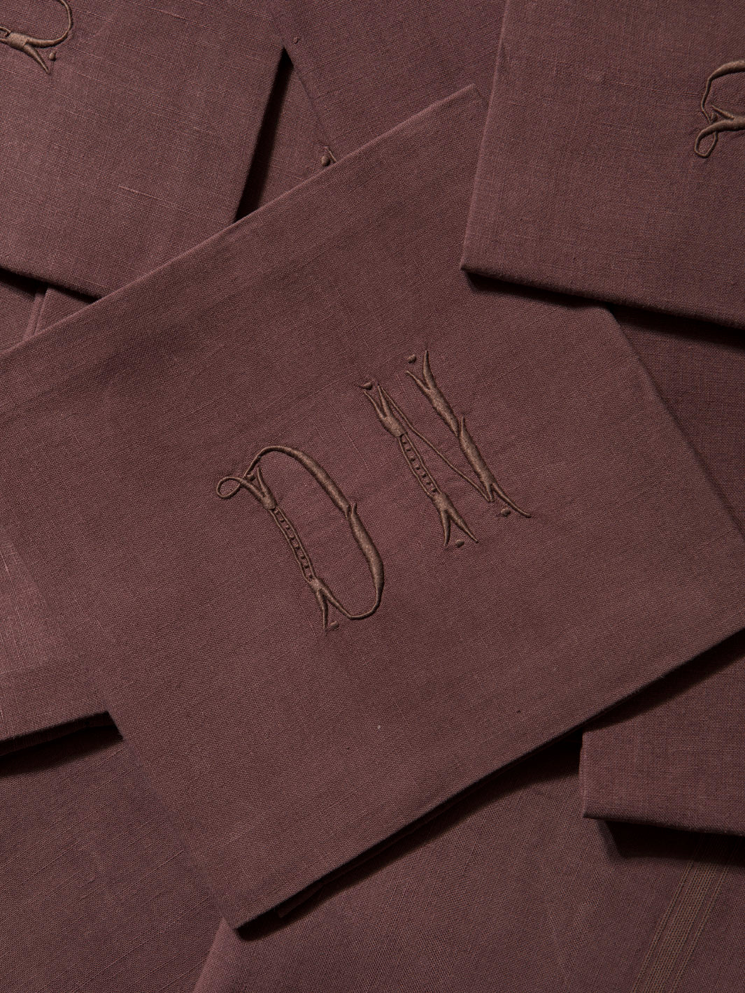 Juego de 12 servilletas de Damasco francés original de los años 20 en color vino desgastado con las iniciales DN bordadas a mano.