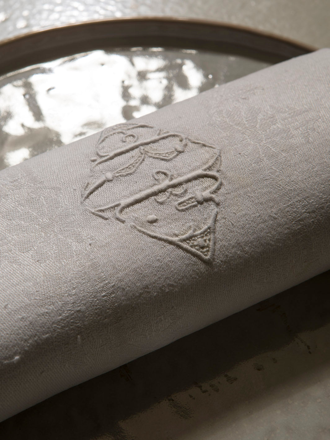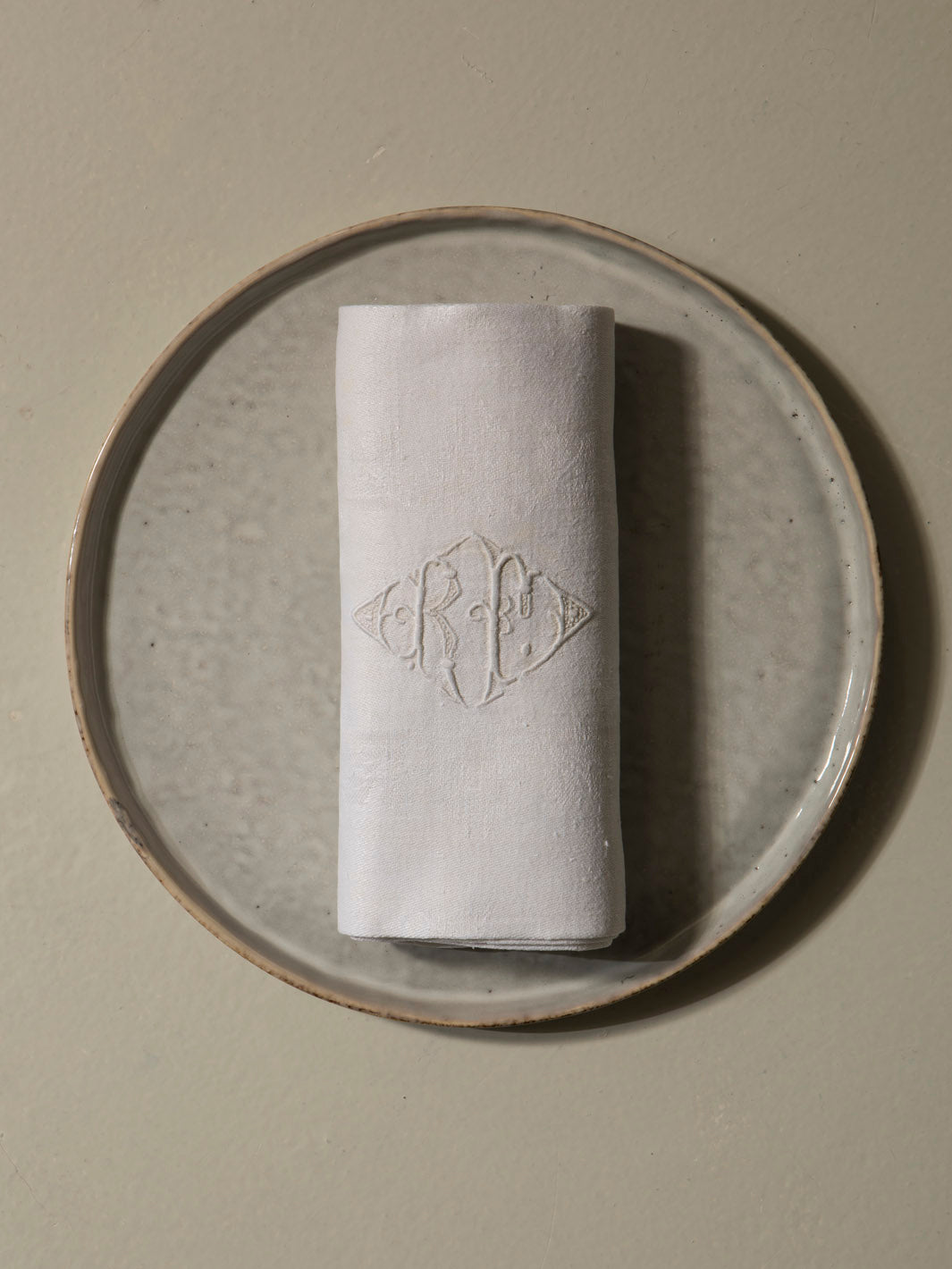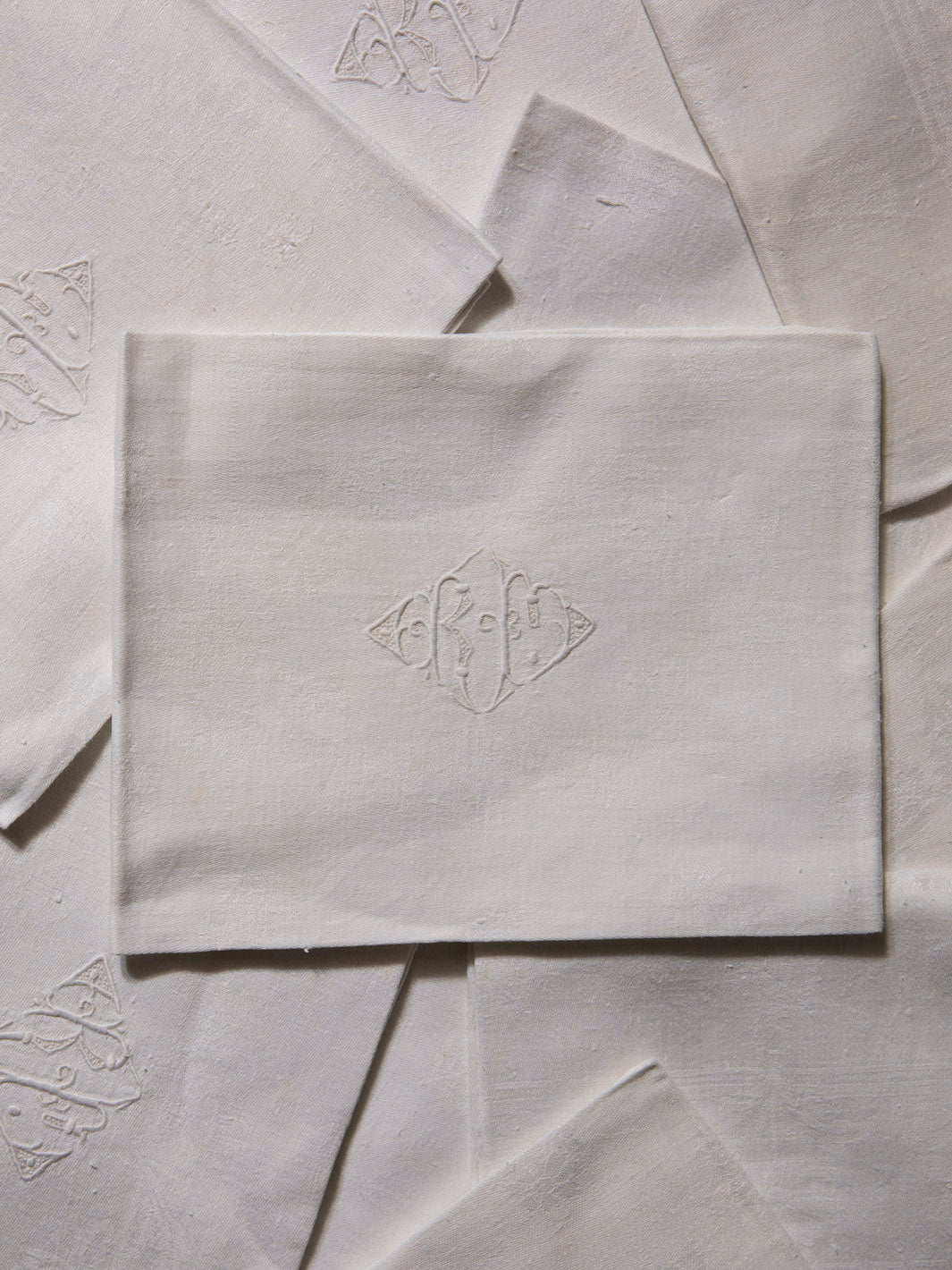 Juego de 12 servilletas de Damasco francés original de los años 20 en color blanco desgastado con las iniciales RF bordadas a mano.