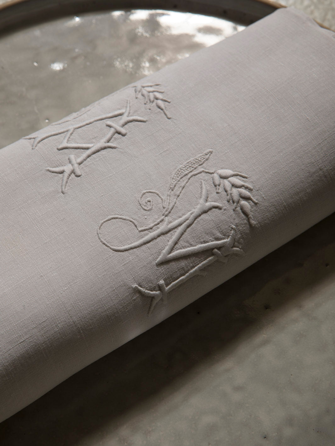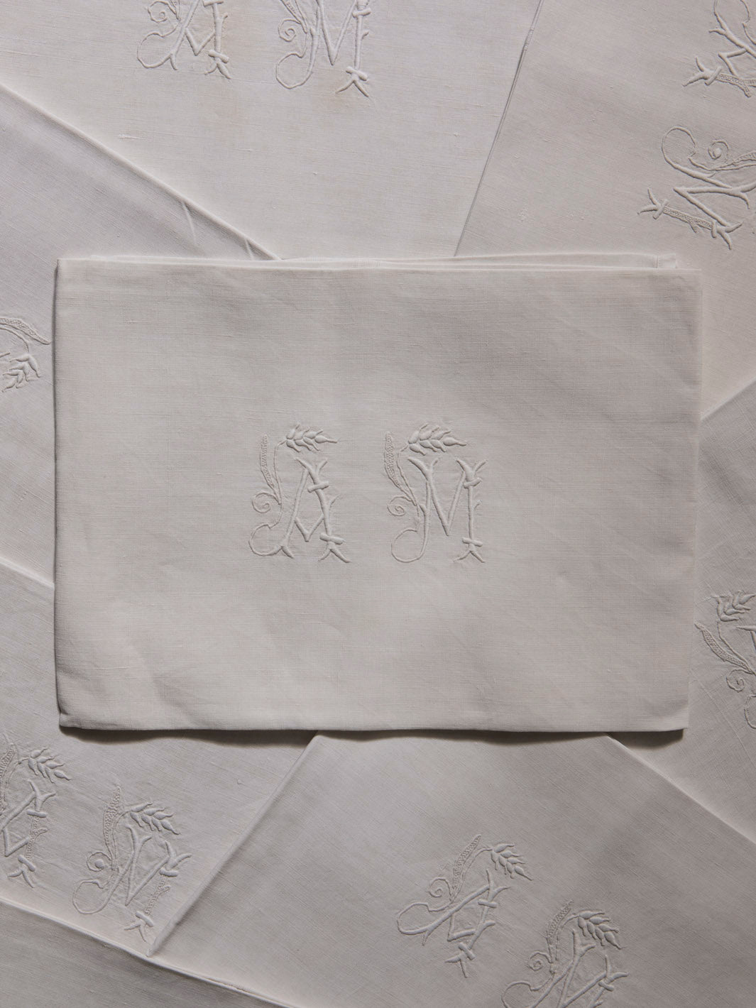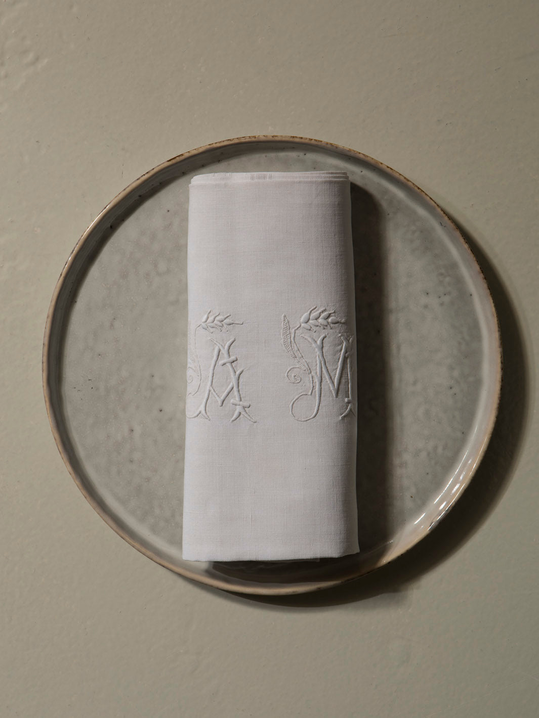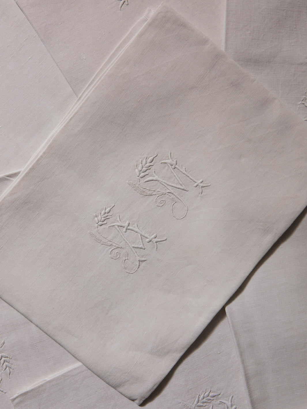 Juego de 8 servilletas de Damasco francés original de los años 20 en color blanco desgastado con las iniciales AM bordadas a mano.