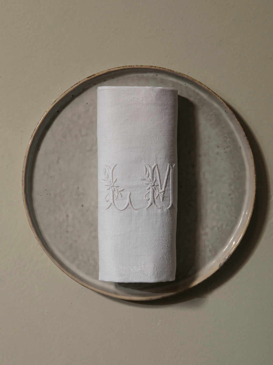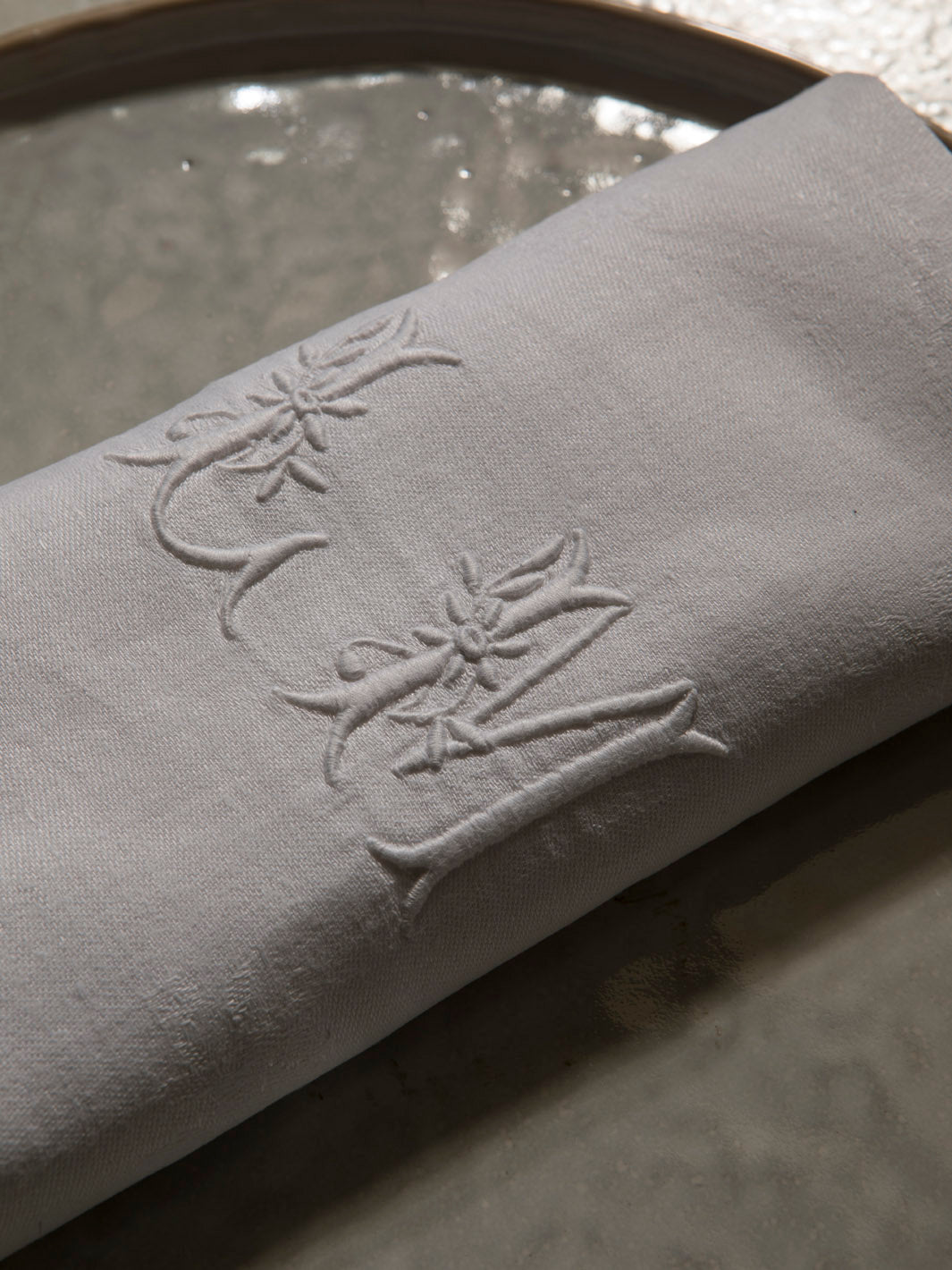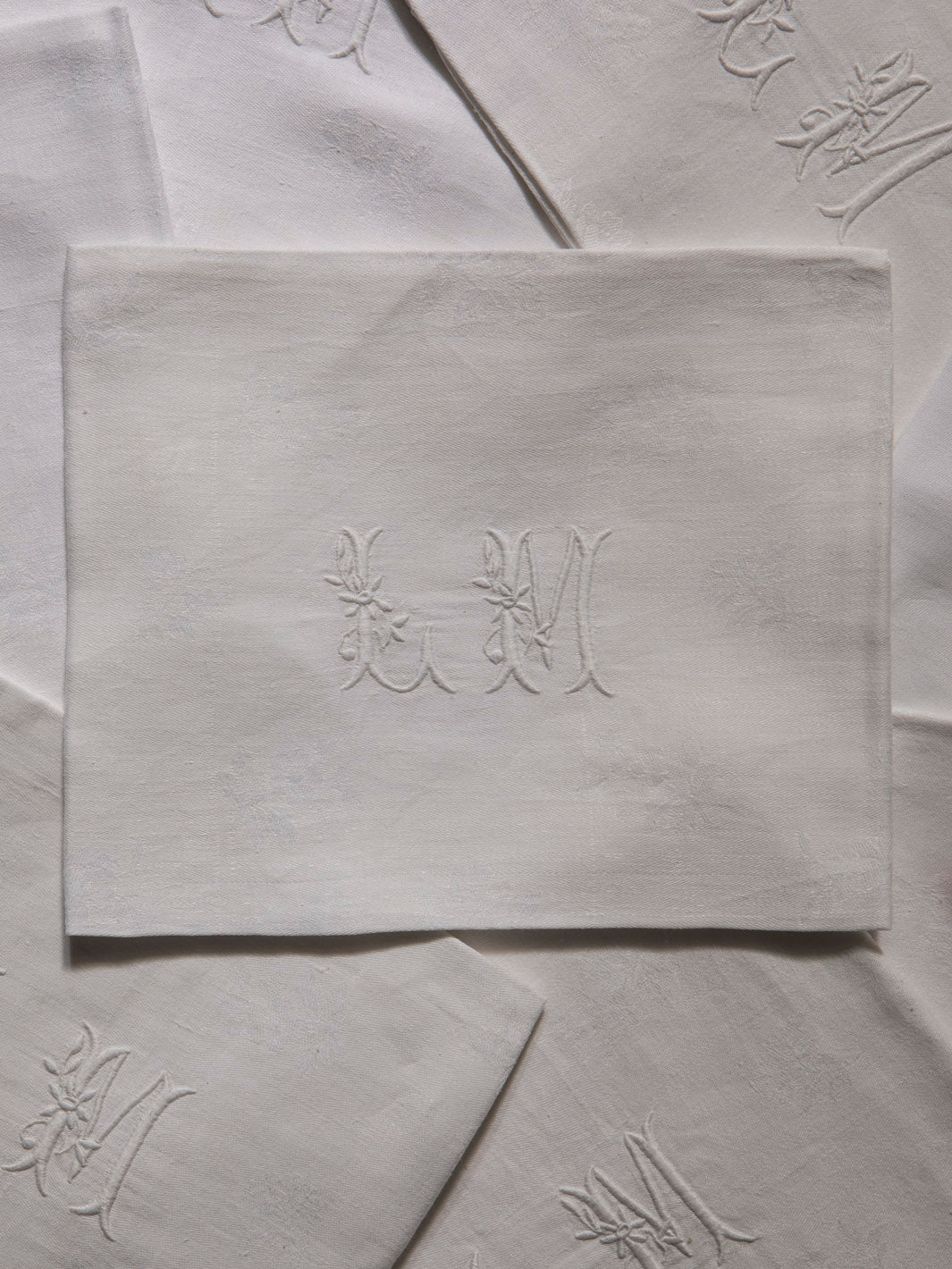 Juego de 8 servilletas de Damasco francés original de los años 20 en color blanco desgastado con las iniciales LM bordadas a mano.