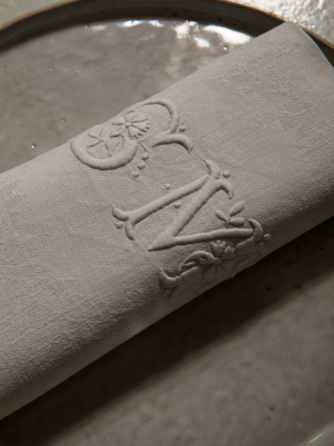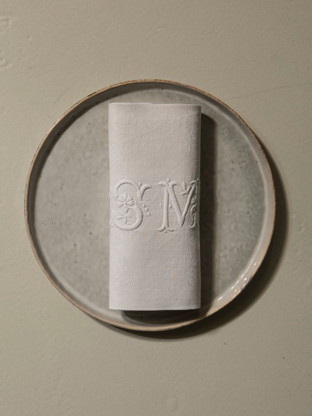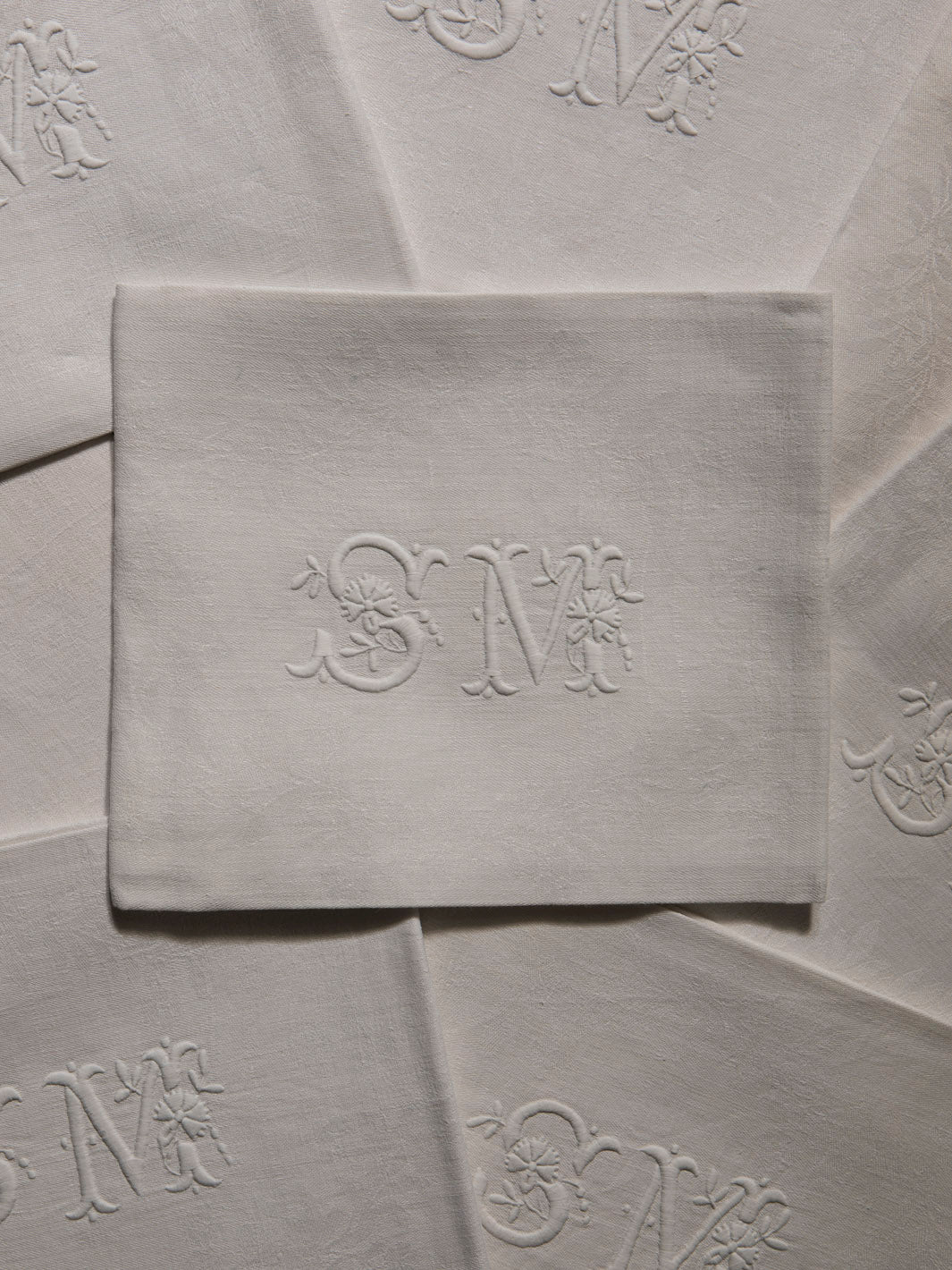 Juego de 8 servilletas de Damasco francés original de los años 20 en color blanco desgastado con las iniciales SM bordadas a mano.