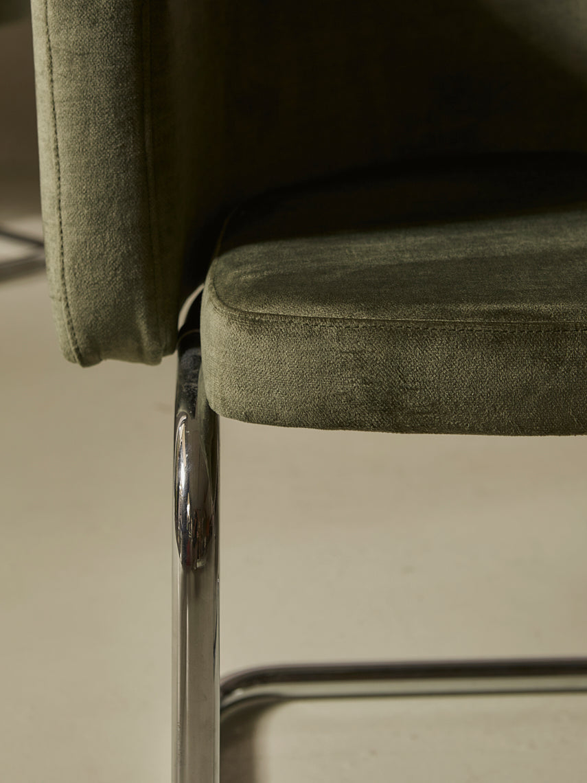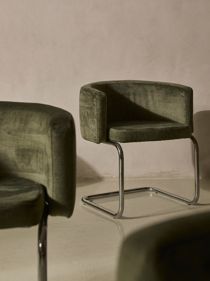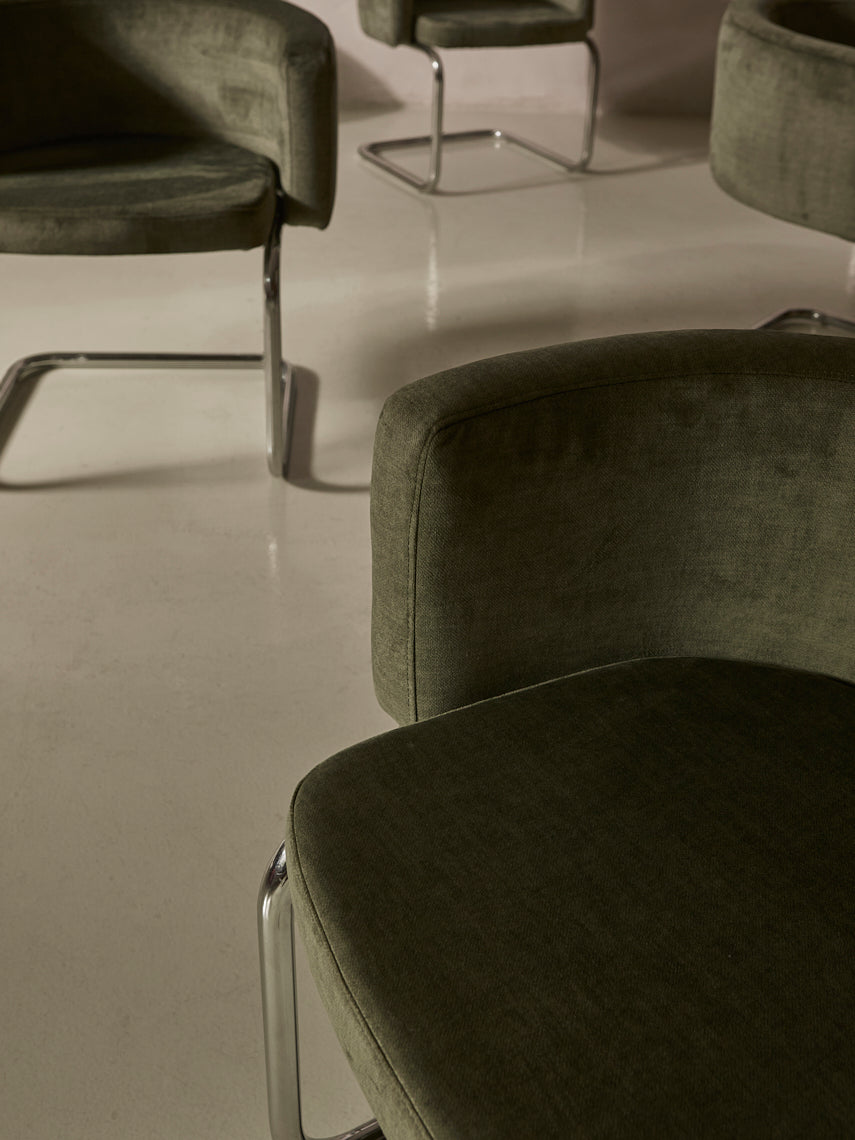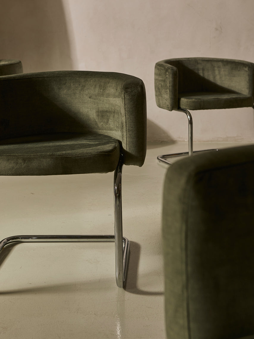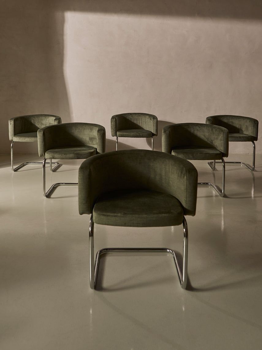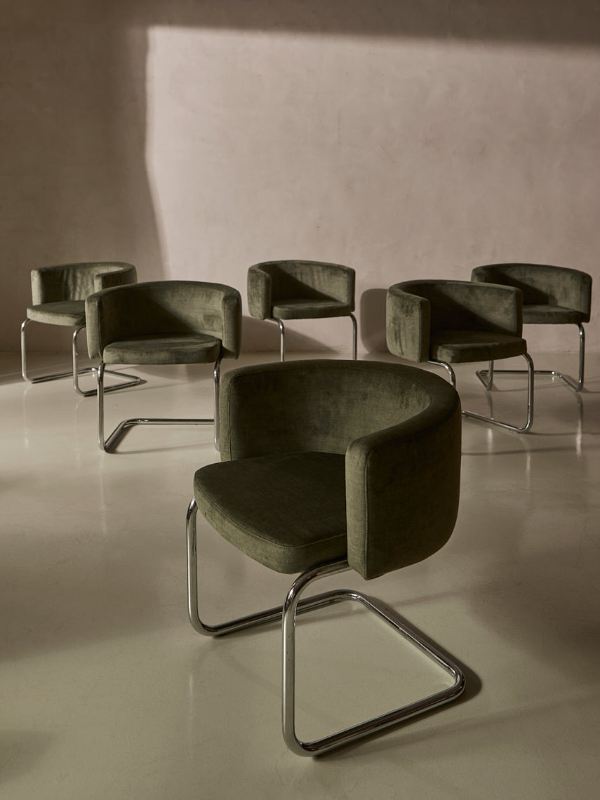 Juego de 6 sillas italianas de los años 70, con elegante respaldo curvo y base de metal cromado.