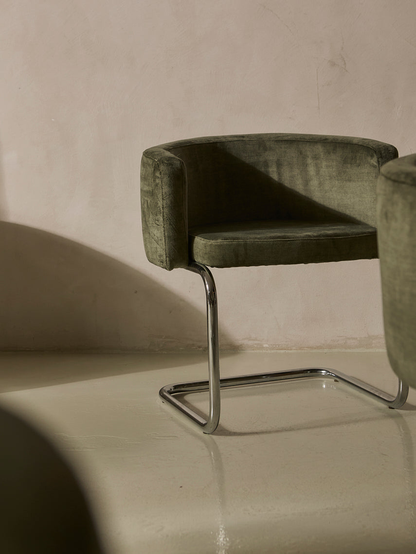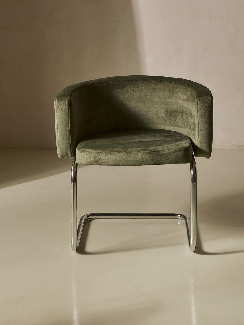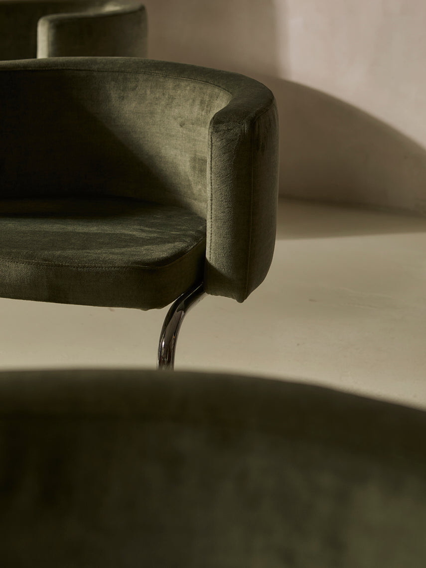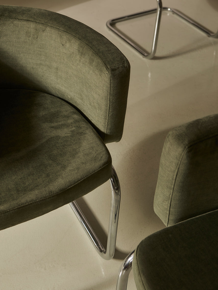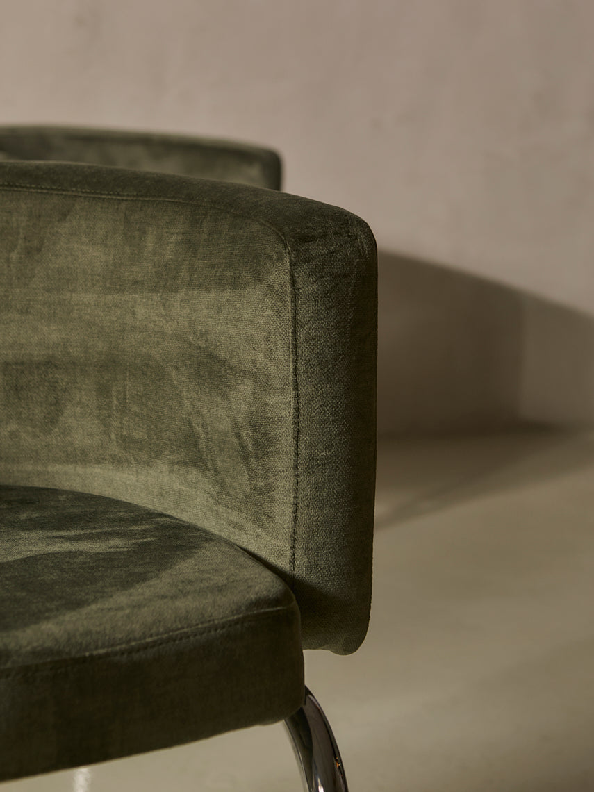 Juego de 6 sillas italianas de los años 70, con elegante respaldo curvo y base de metal cromado.