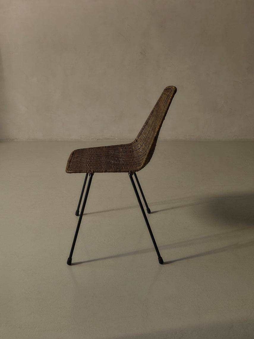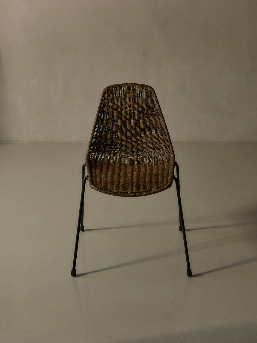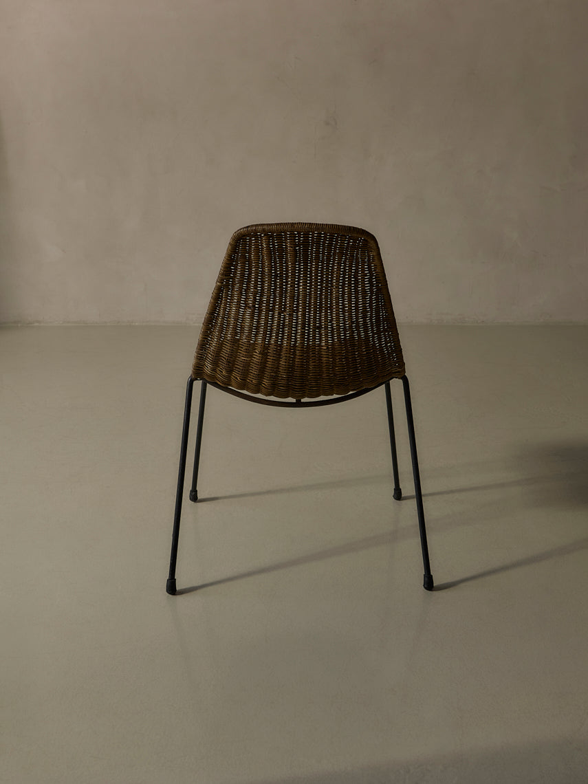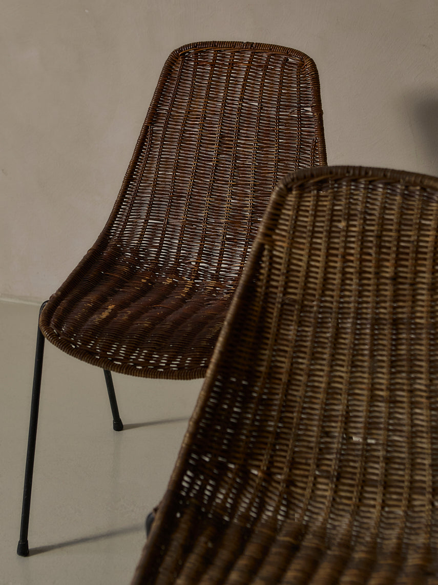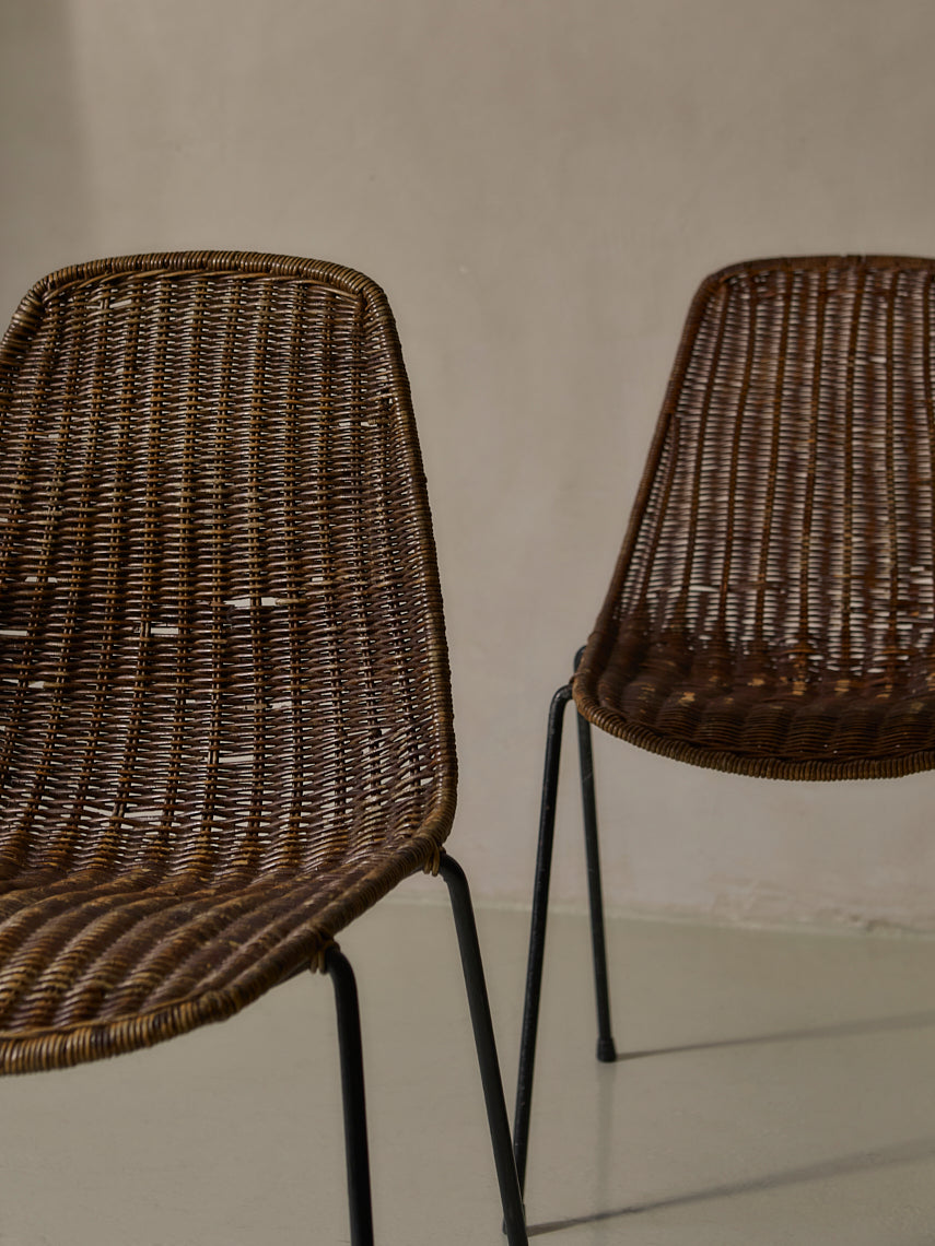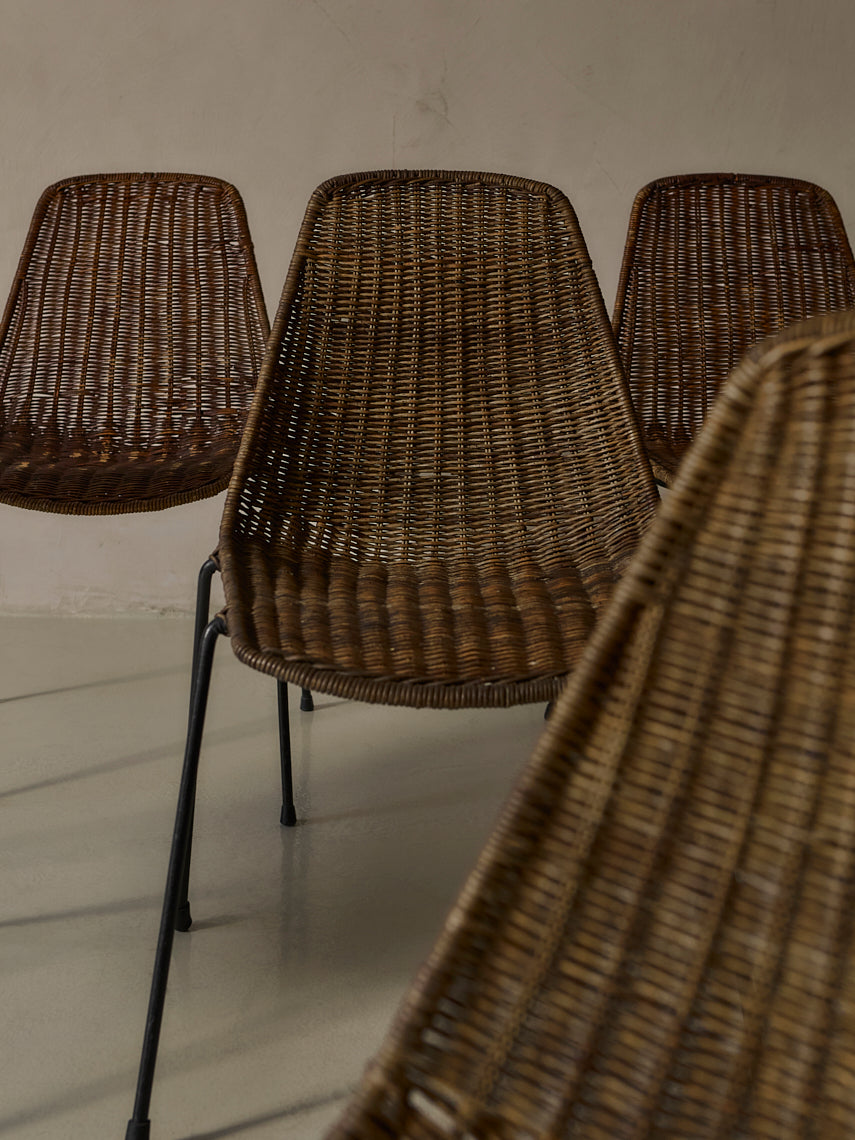 Juego de 8 sillas italianas de los diseñadores italianos Franco Campo y Carlo Graffi de ratán y hierro negro originales de los años 50.