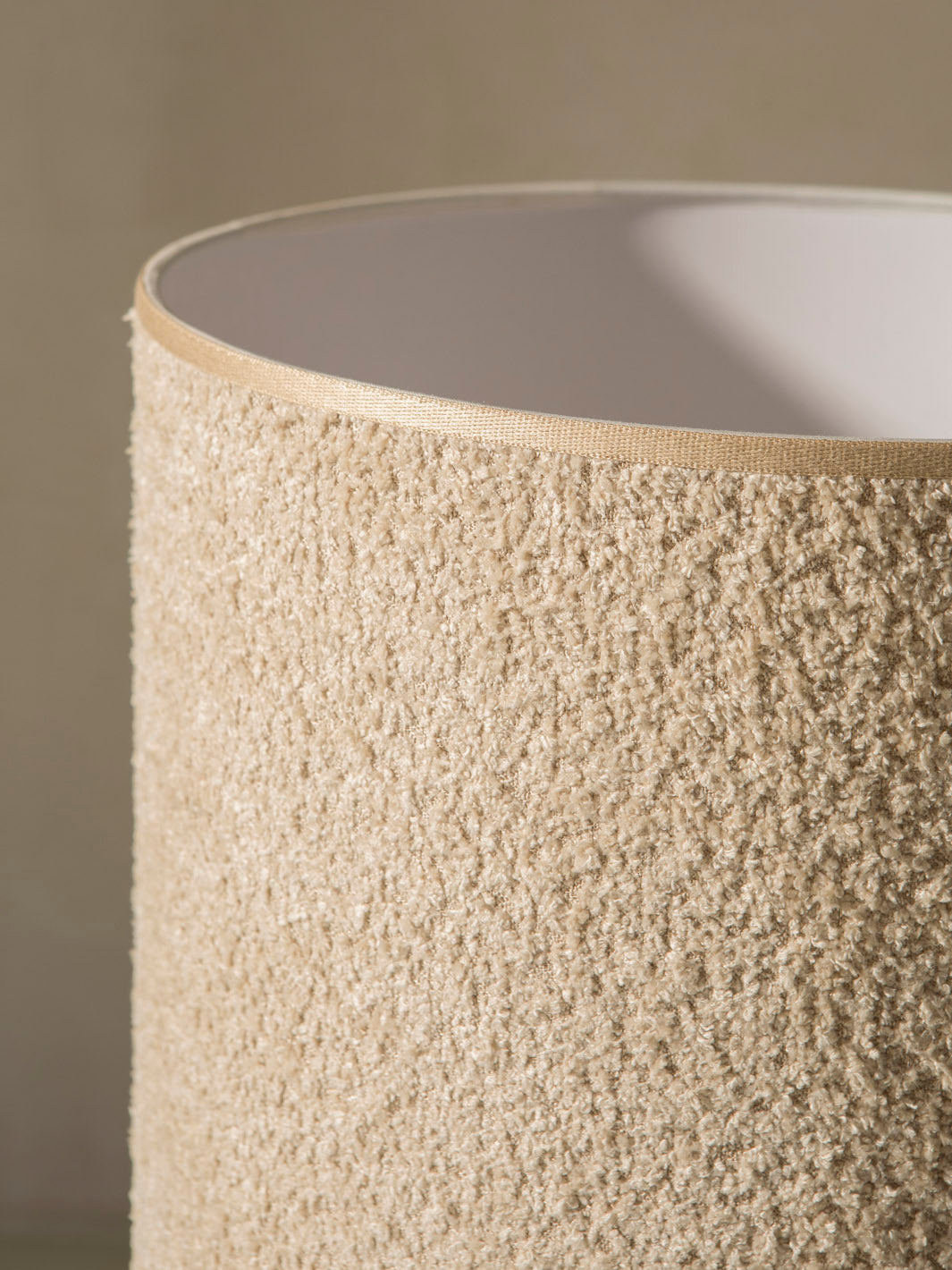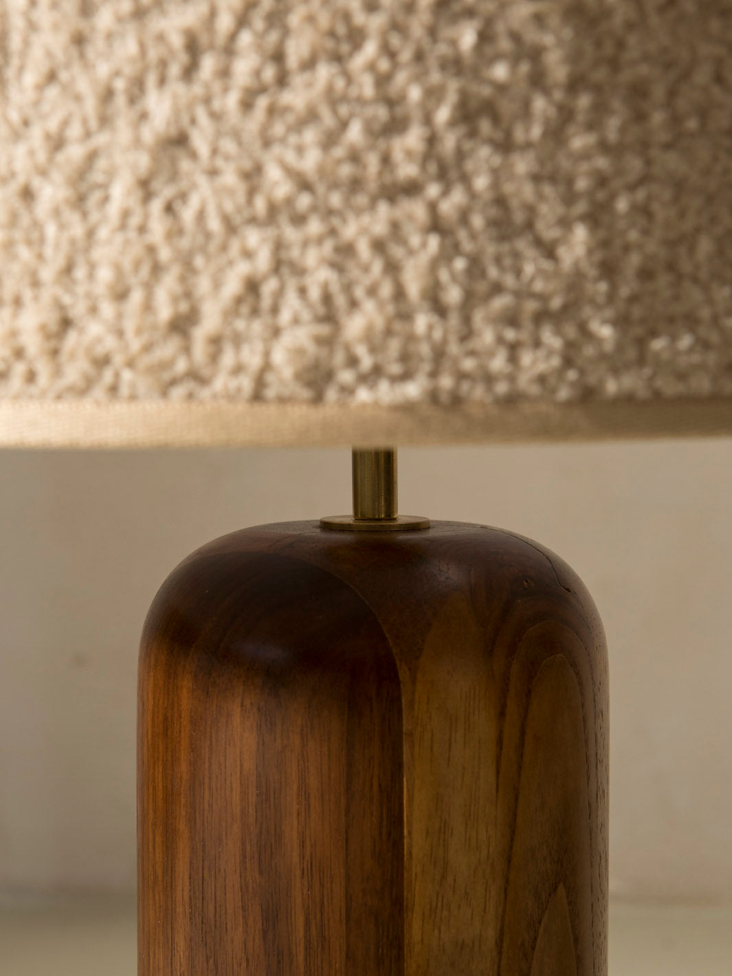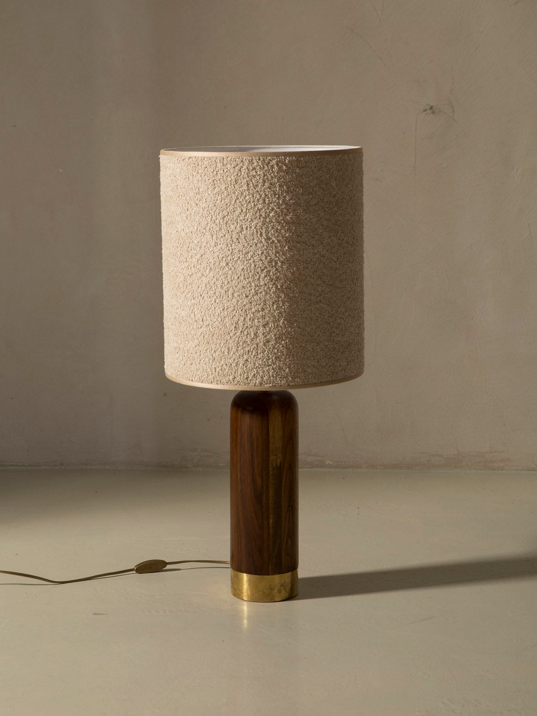 Lámpara italiana en madera fresno & latón con pantalla en lana bouclé.