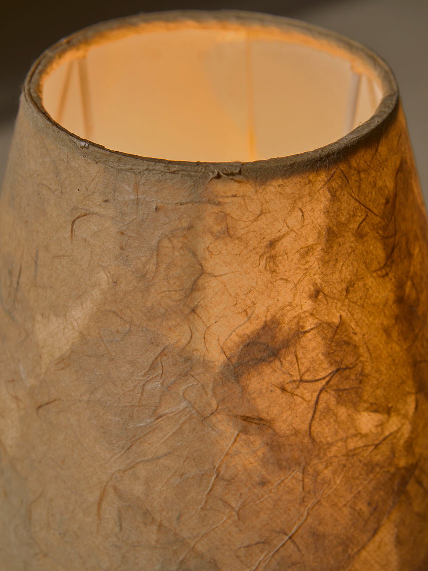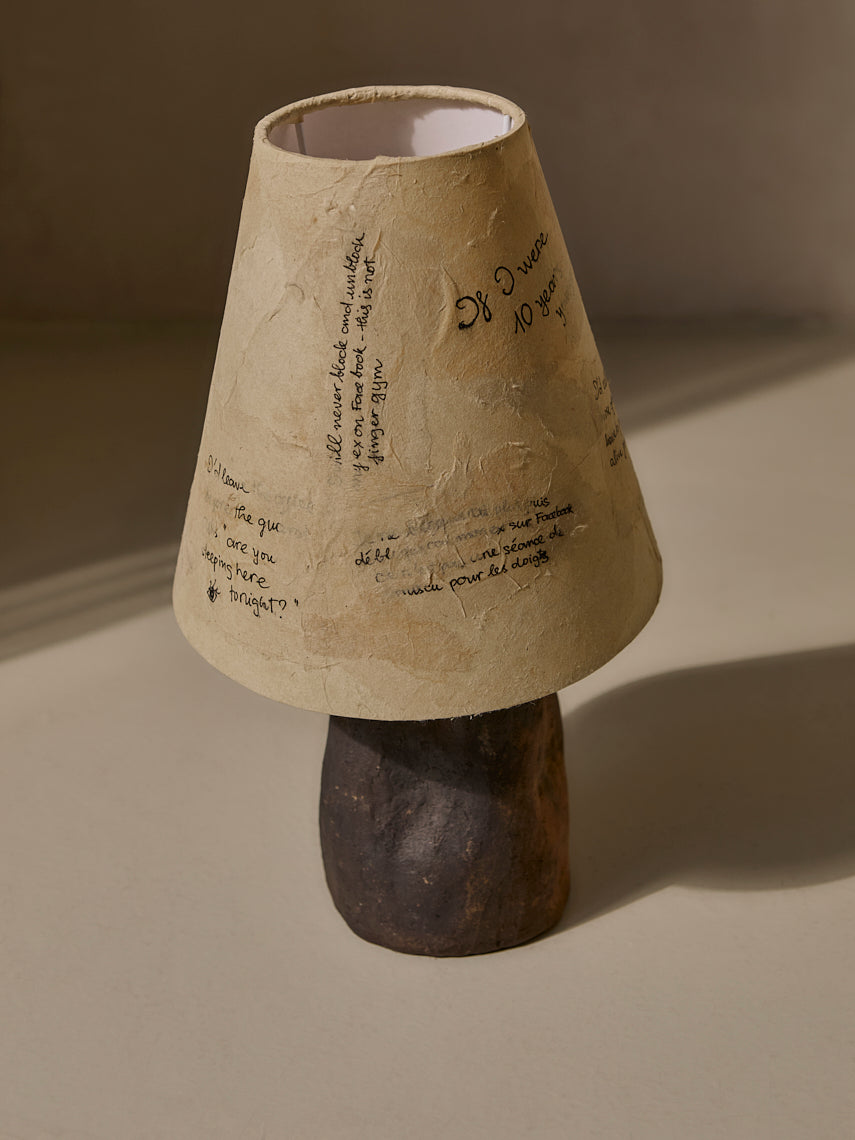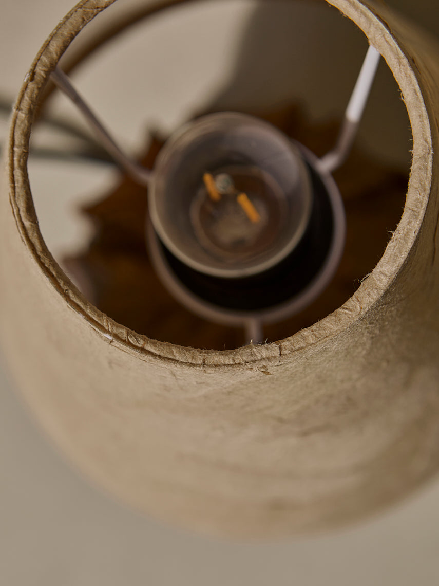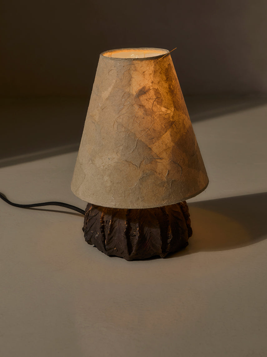 Lámpara de mesa diseñada y fabricada por una artesanos vietnamitas, con base de cerámica modelada a mano con pantalla de esponja vegetal.