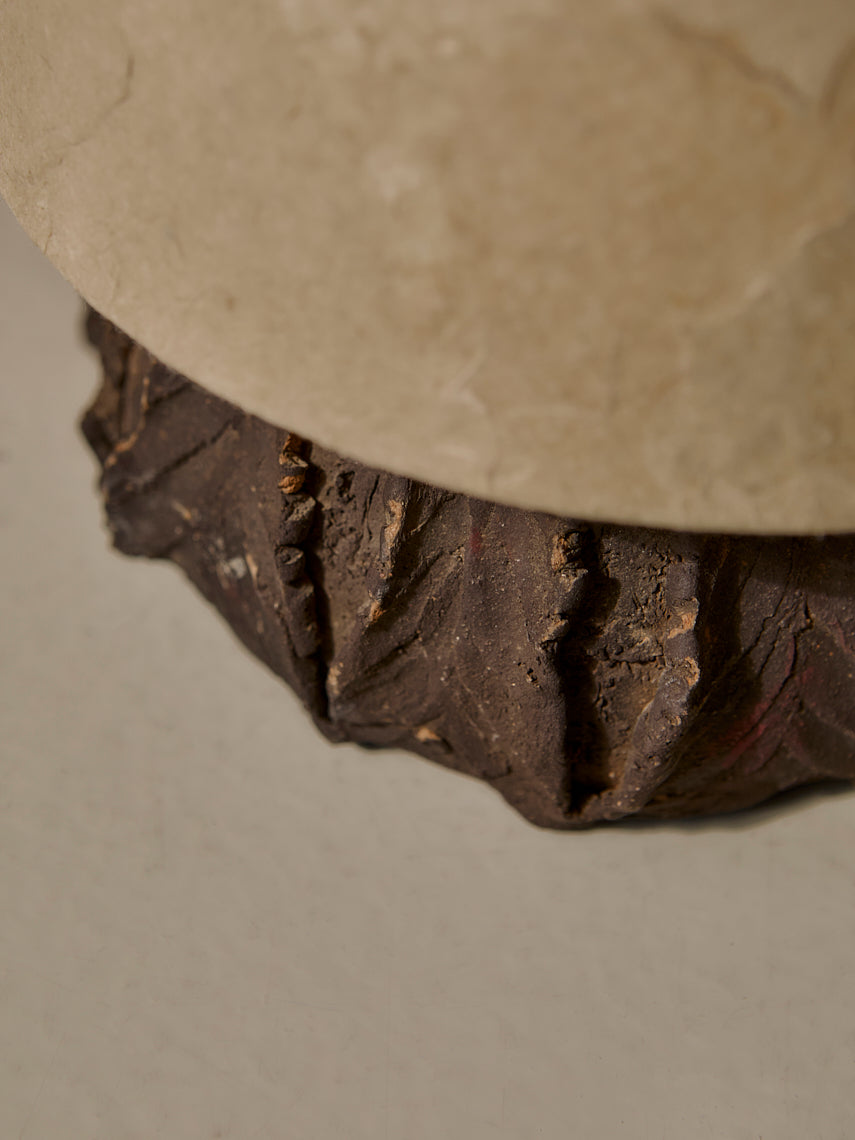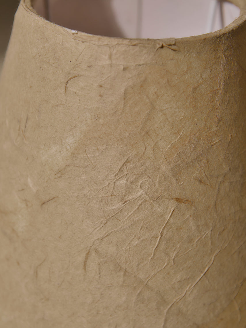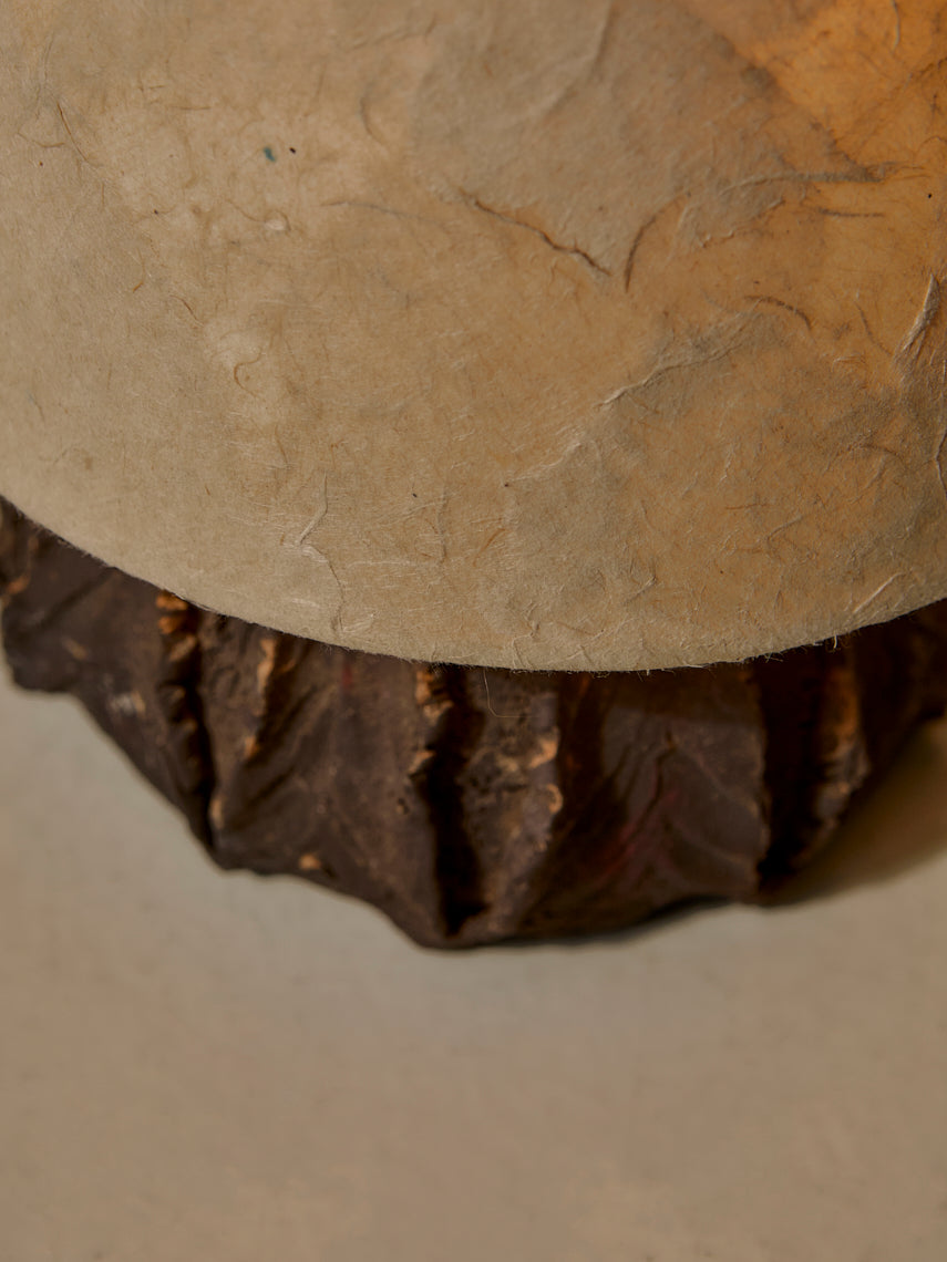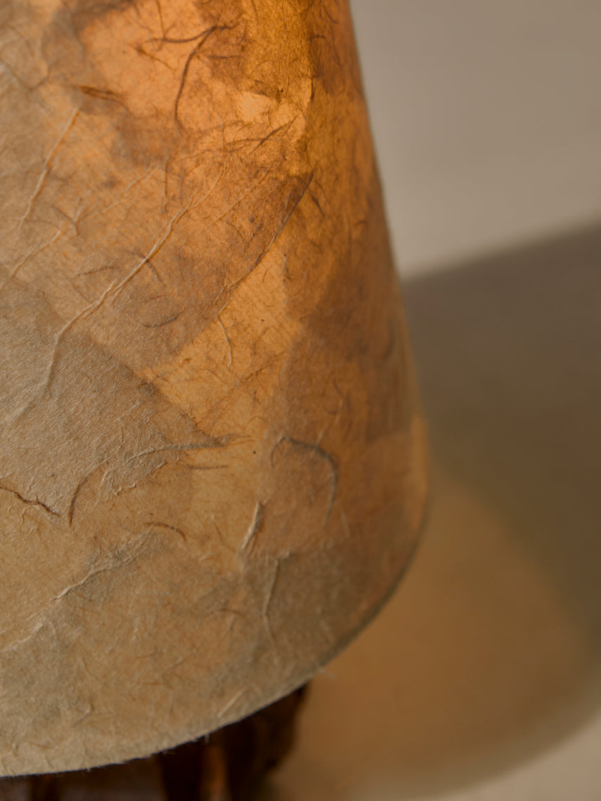 Lámpara de mesa diseñada y fabricada por una artesanos vietnamitas, con base de cerámica modelada a mano con pantalla de esponja vegetal.