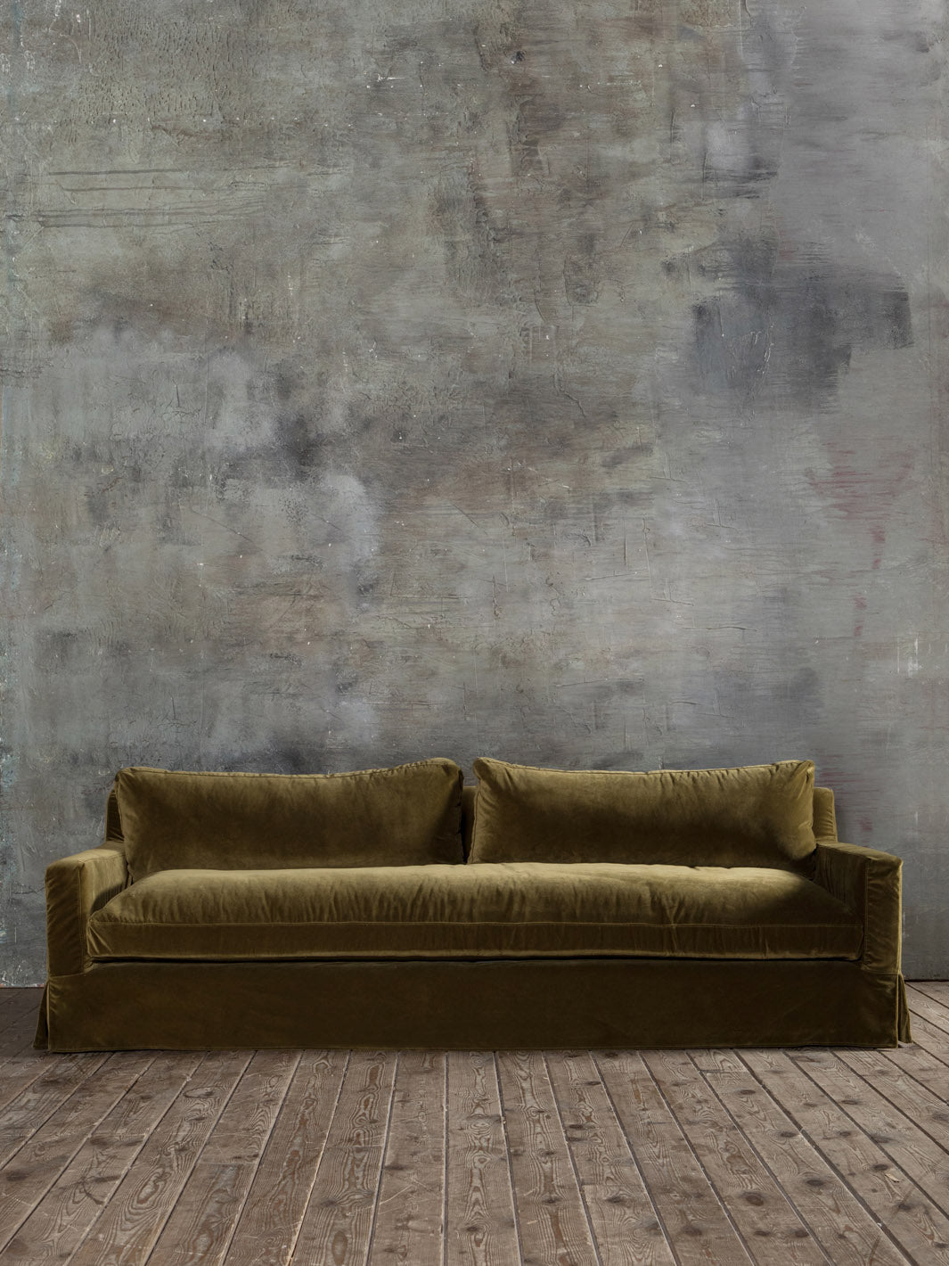 Sofá de inspiración Belga en terciopelo desenfundable de color verde musgo. Es confortable y ergonómico y al ser mullido te atrapa en su suave terciopelo.
