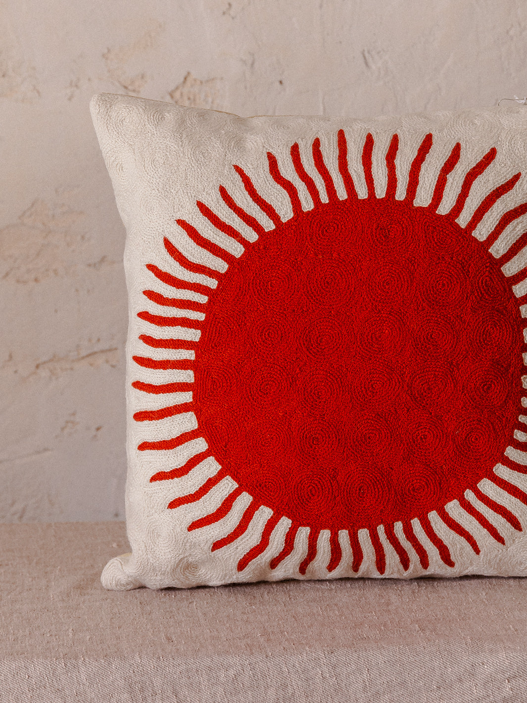 Cojín de Lindell & Co. diseñado en exclusiva por Gabrielle Soyer y fabricado 100% a mano: bordados, tejidos y tintes están hechos por artesanos de India y Nepal. Los materiales utilizados son lana de Nueva Zelanda y seda india. Sus delicadas irregularidades son parte de su innegable personalidad y prueba de su autenticidad. Todas las creaciones de Lindell & Co. están producidas en pequeñas cantidades.