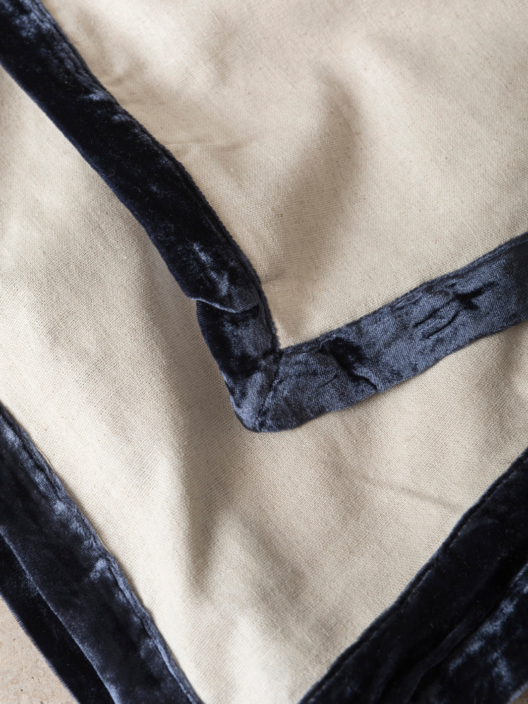 Cortina de lino 100% en color natural con vivo azul en terciopelo. El precio incluye una cortina y diez anillas.