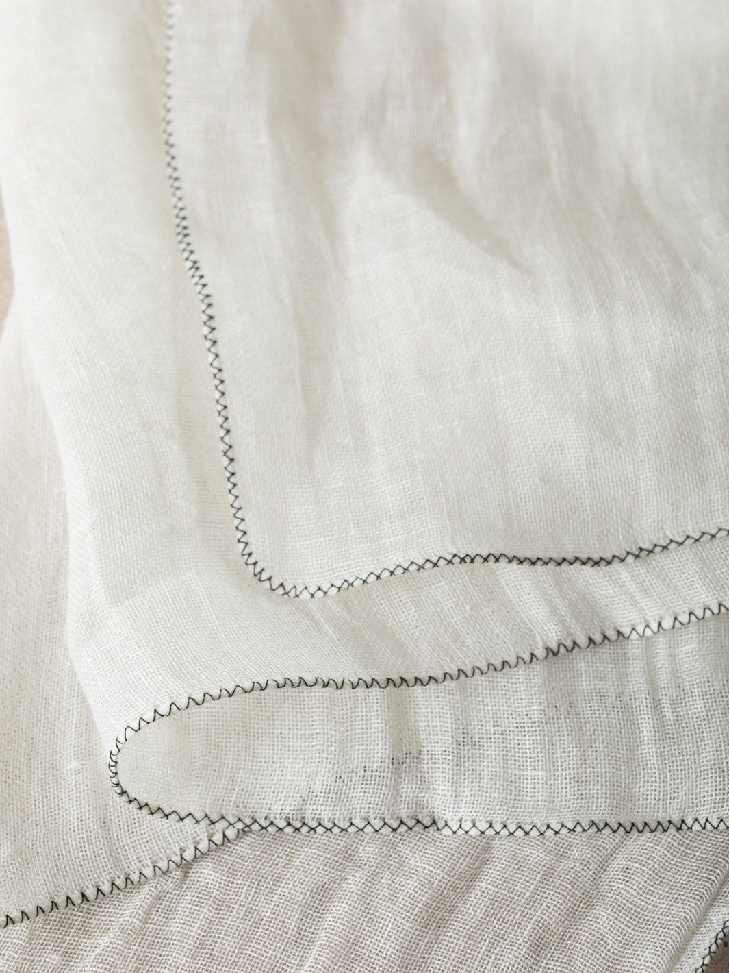 Cortina de lino 100% en color blanco con un delicado ribete negro. El precio incluye una cortina y diez anillas.