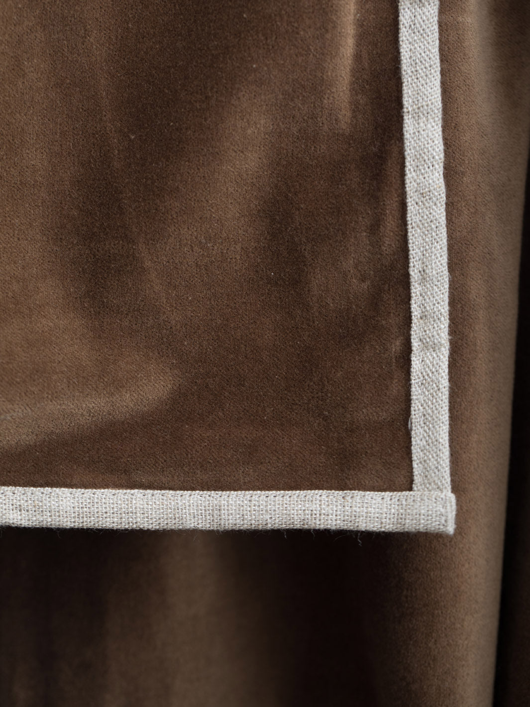 Cortina de terciopelo de algodón en color topo con vivo de lino beige. El precio incluye una caída de cortina y anillas.