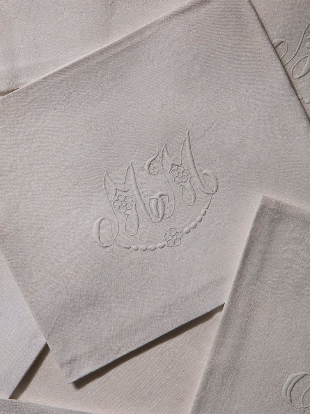 Juego de 10 servilletas de Damasco francés original de los años 20 en color blanco desgastado con las iniciales GB bordadas a mano.