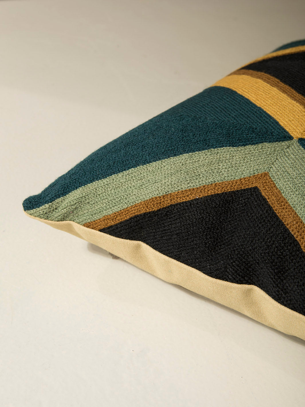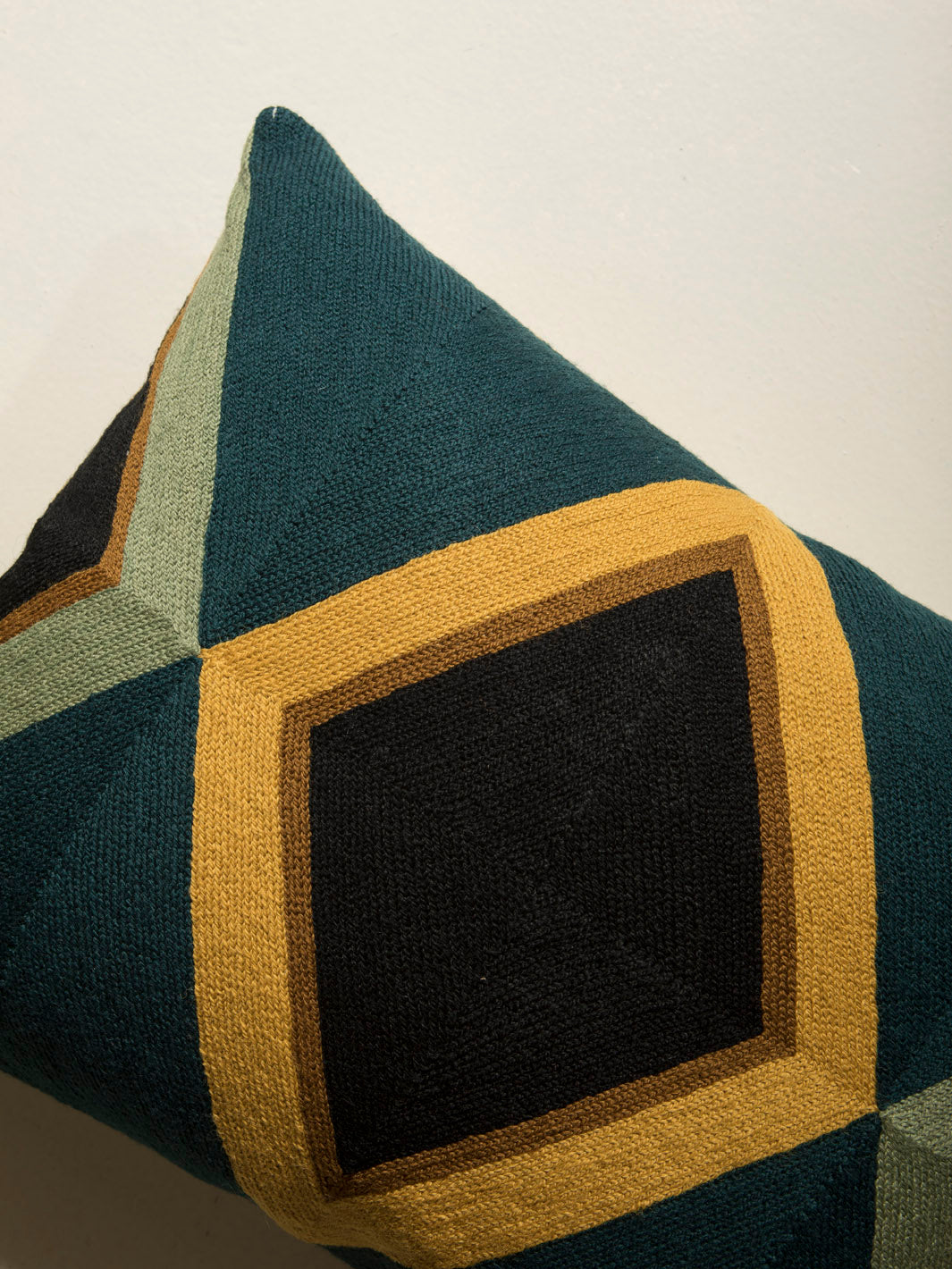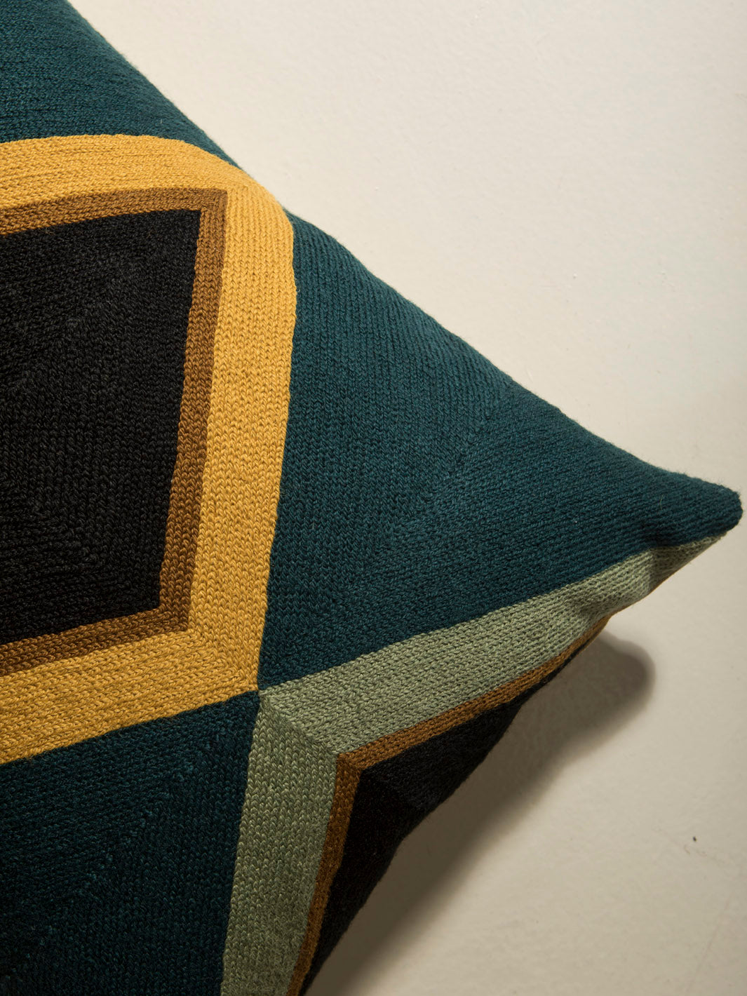 Cojín de Lindell & Co. diseñado en exclusiva por Gabrielle Soyer y fabricado 100% a mano: bordados, tejidos y tintes están hechos por artesanos de India y Nepal. Los materiales utilizados son lana de Nueva Zelanda y seda india. Sus delicadas irregularidades son parte de su innegable personalidad y prueba de su autenticidad. Todas las creaciones de Lindell & Co. están producidas en pequeñas cantidades.