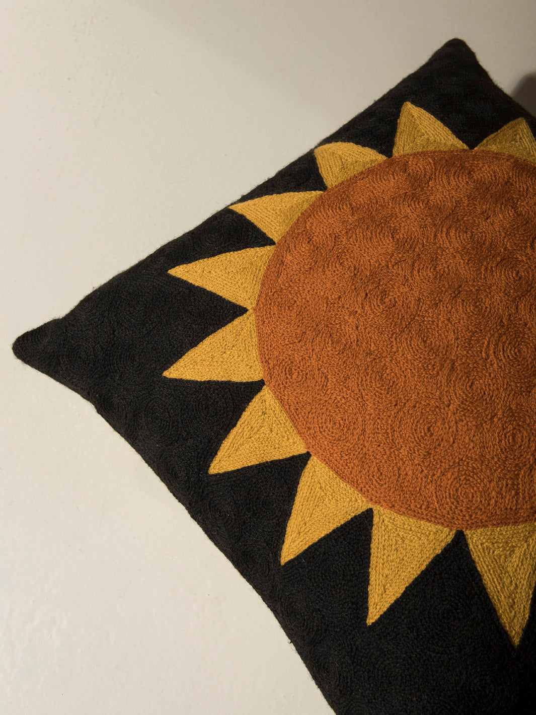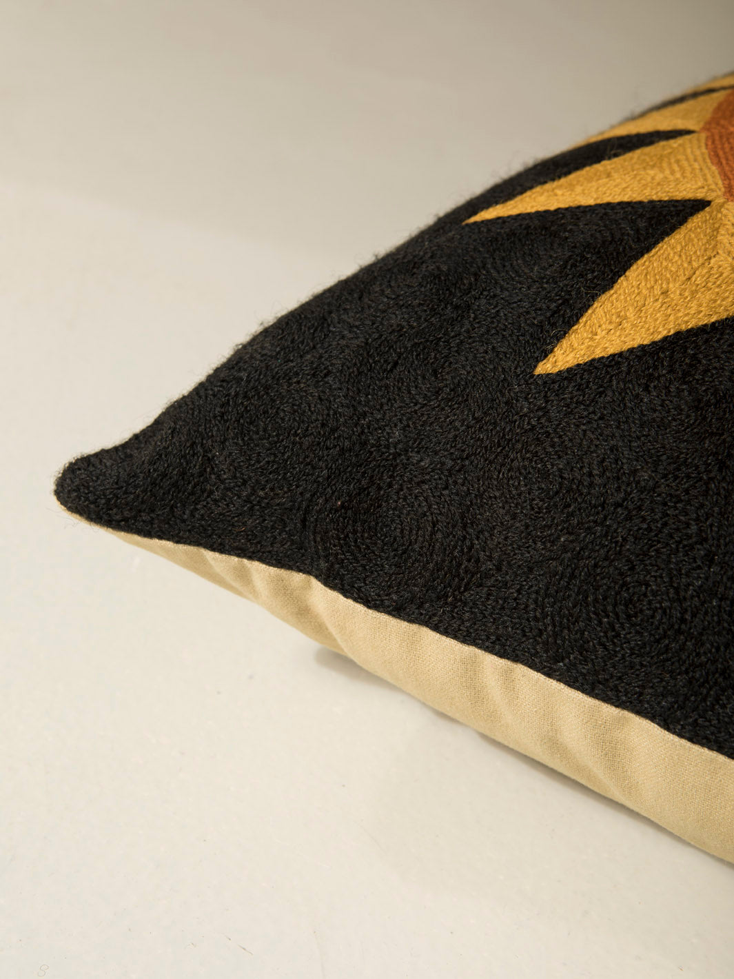 Cojín de Lindell & Co. diseñado en exclusiva por Gabrielle Soyer y fabricado 100% a mano: bordados, tejidos y tintes están hechos por artesanos de India y Nepal. Los materiales utilizados son lana de Nueva Zelanda y seda india. Sus delicadas irregularidades son parte de su innegable personalidad y prueba de su autenticidad. Todas las creaciones de Lindell & Co. están producidas en pequeñas cantidades.