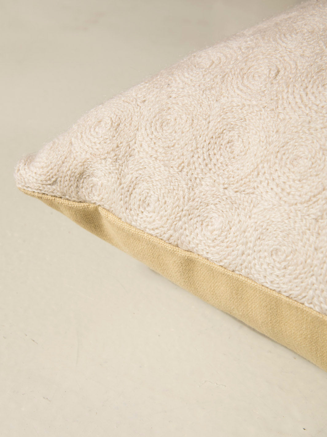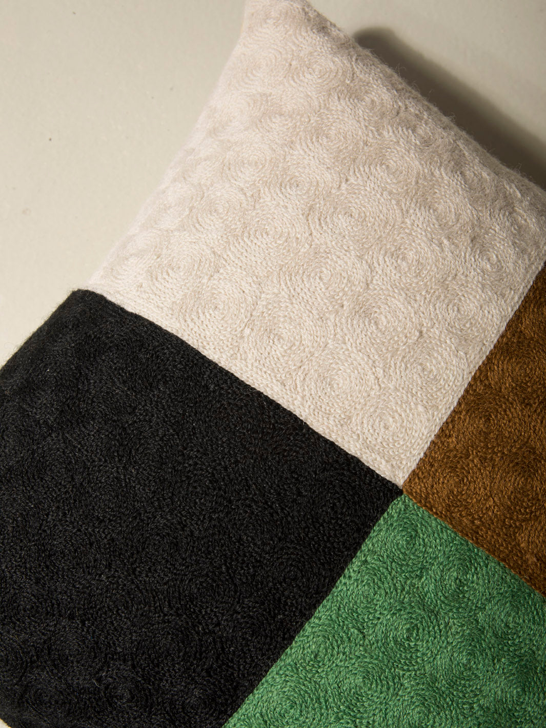 Cojín de Lindell & Co. diseñado en exclusiva por Gabrielle Soyer y fabricado 100% a mano: bordados, tejidos y tintes están hechos por artesanos de India y Nepal. Los materiales utilizados son lana de Nueva Zelanda y seda india. Sus delicadas irregularidades son parte de su innegable personalidad y prueba de su autenticidad. Todas las creaciones de Lindell & Co. están producidas en pequeñas cantidades.